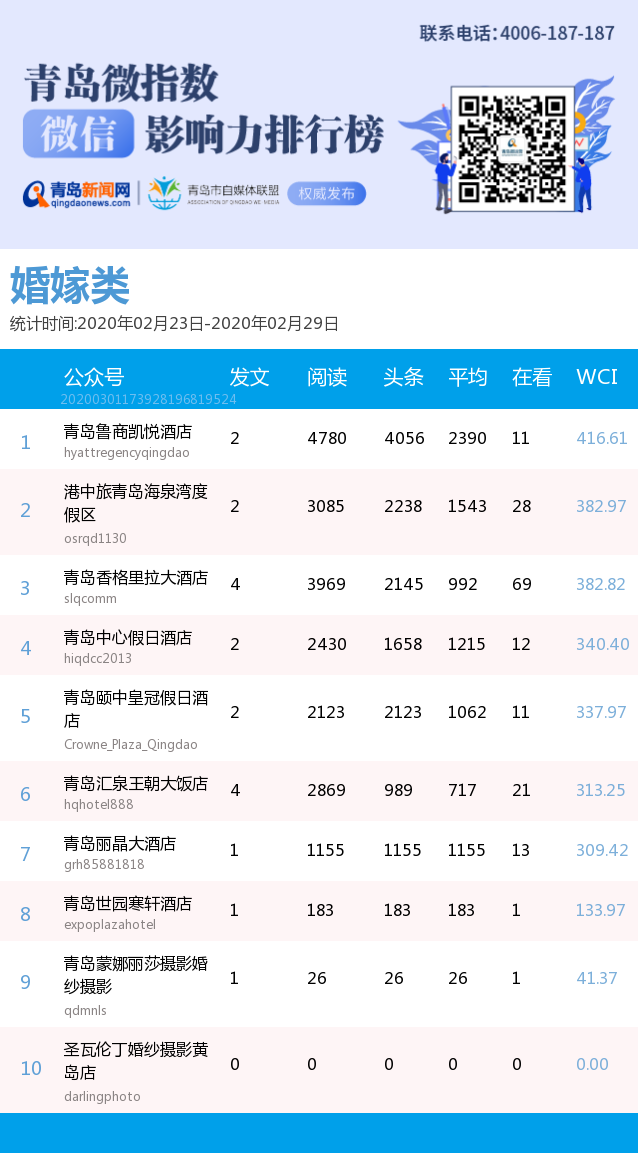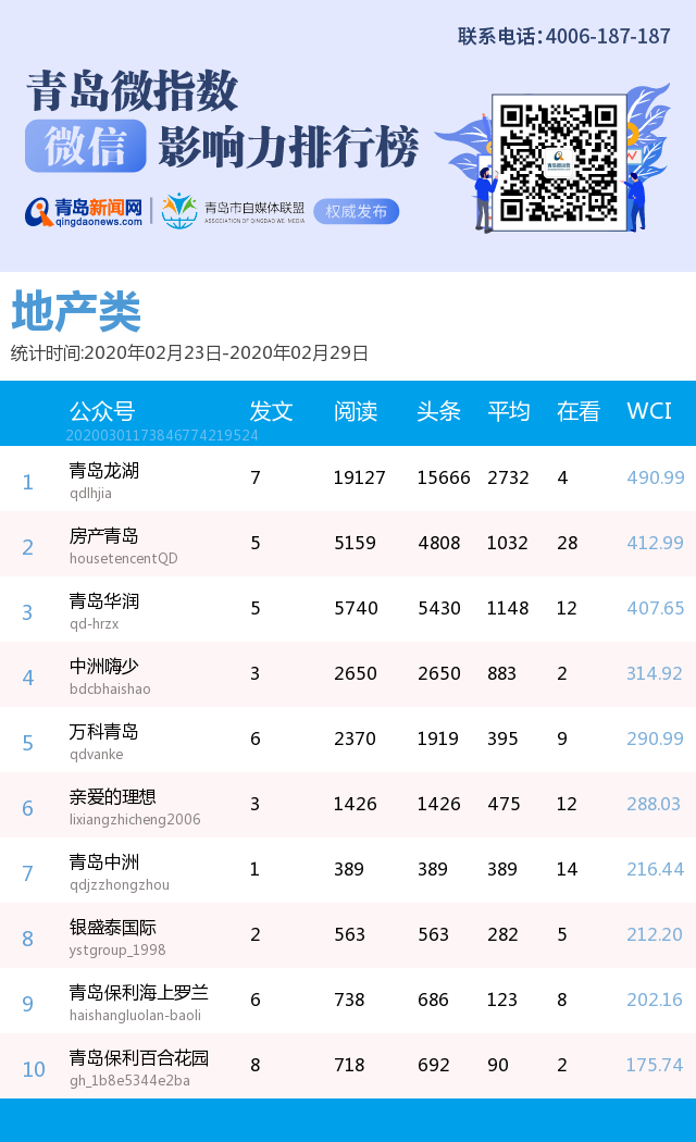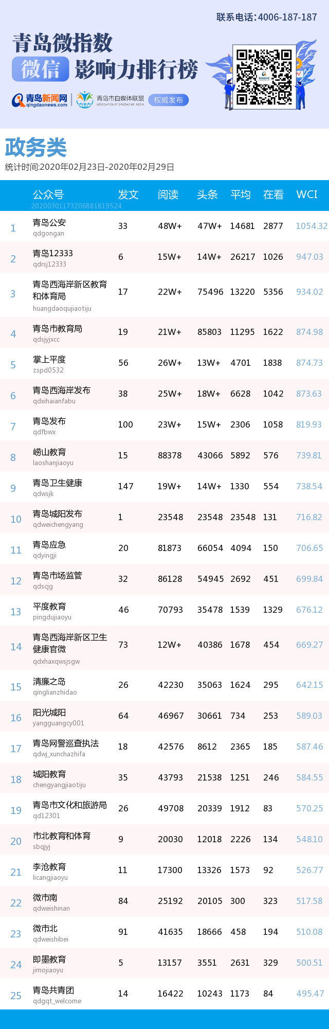 3、本次榜單收錄了青島14個(gè)行業(yè)微信公眾號(hào),如您的賬號(hào)暫未收錄,可聯(lián)系4006-187-187。