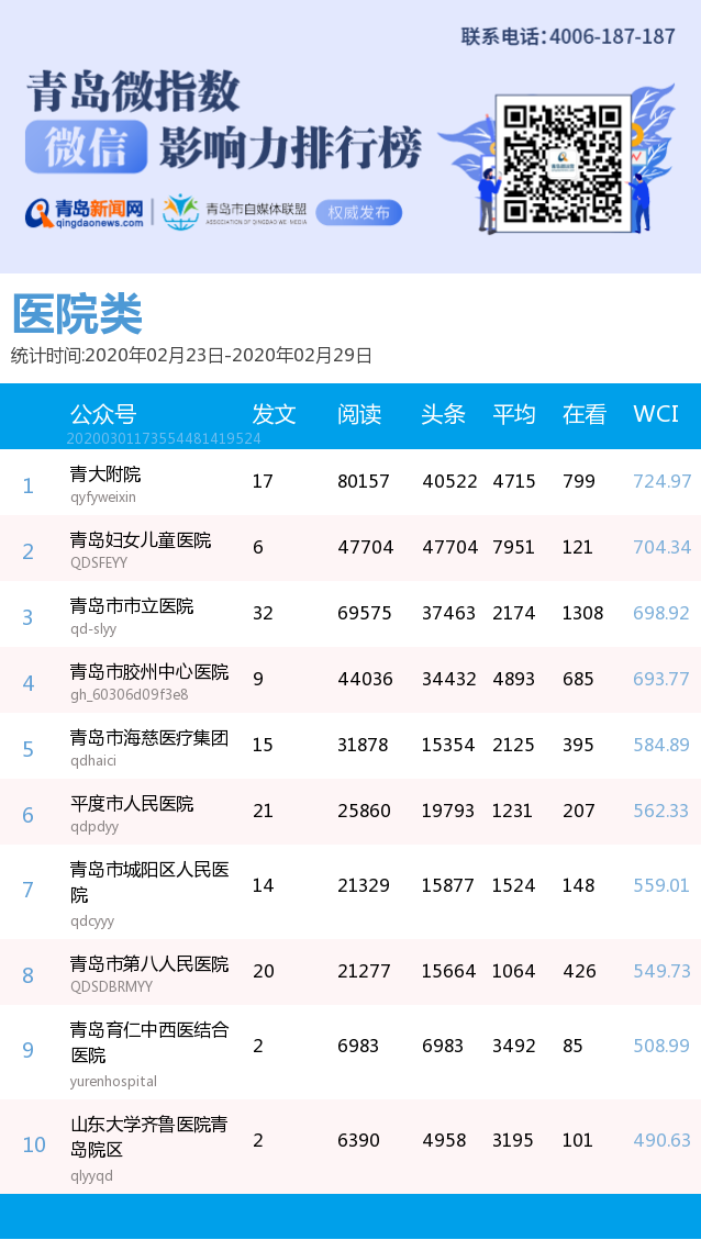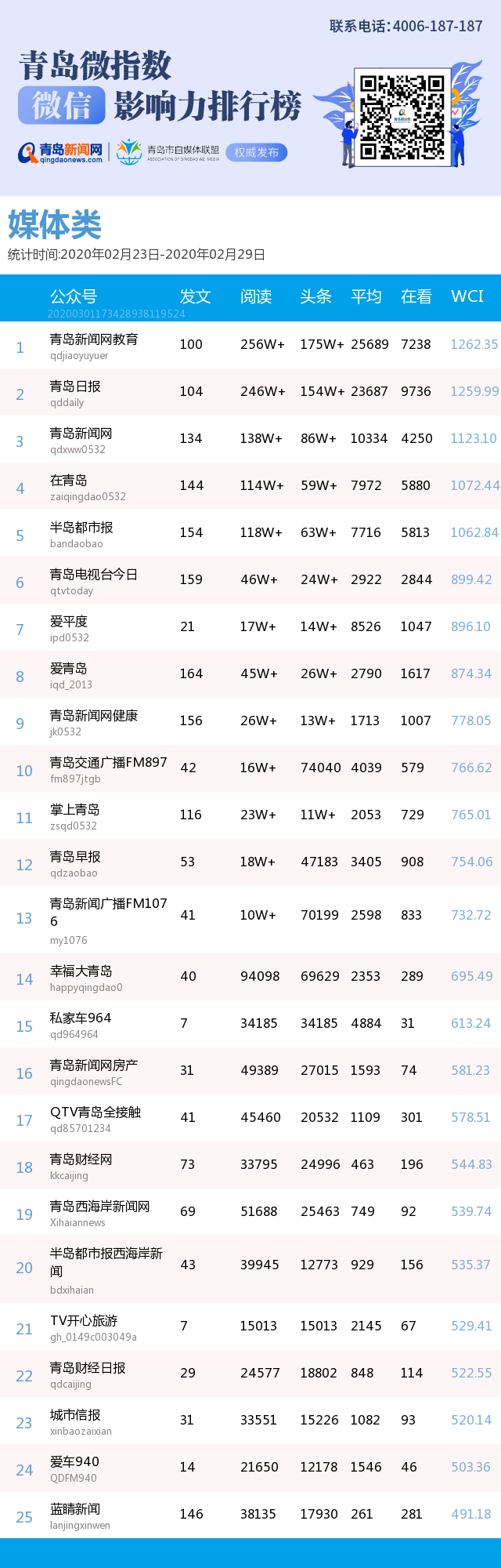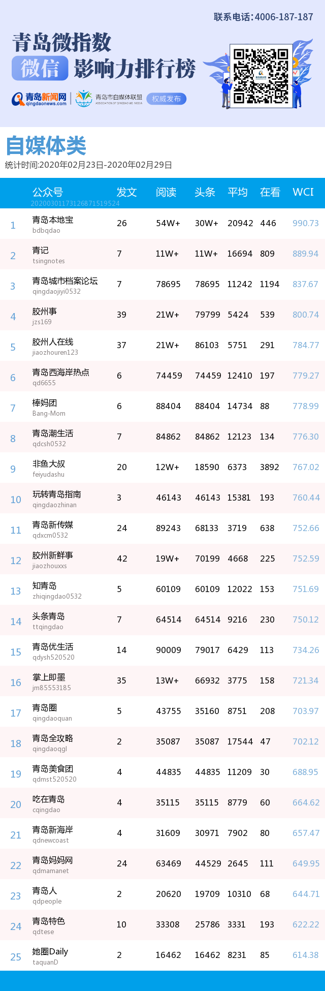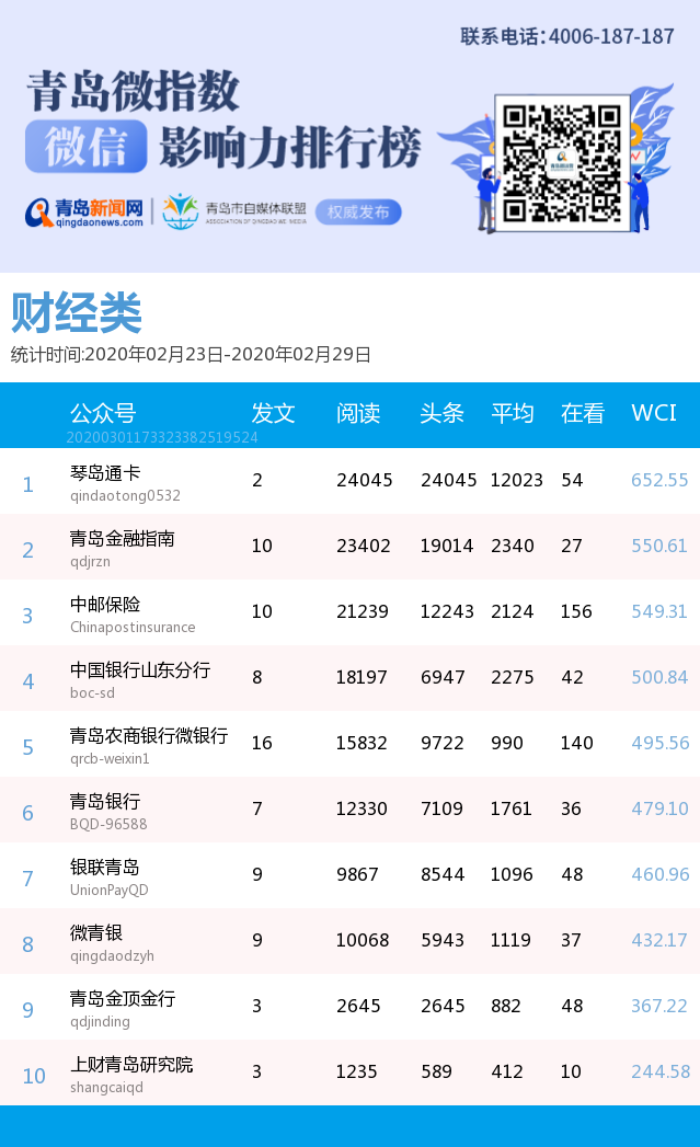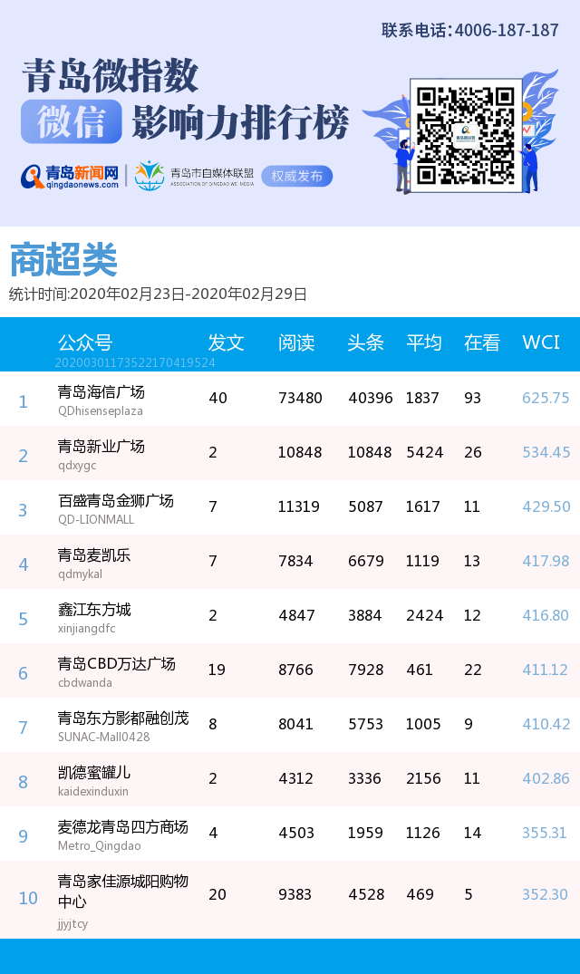 青島新聞網(wǎng)3月2日訊(記者 邢書玲)由青島新聞網(wǎng)打造的“青島微指數(shù)微信影響力排行榜”今日發(fā)布一周(2020年2月23日-2020年2月29日)榜單。
