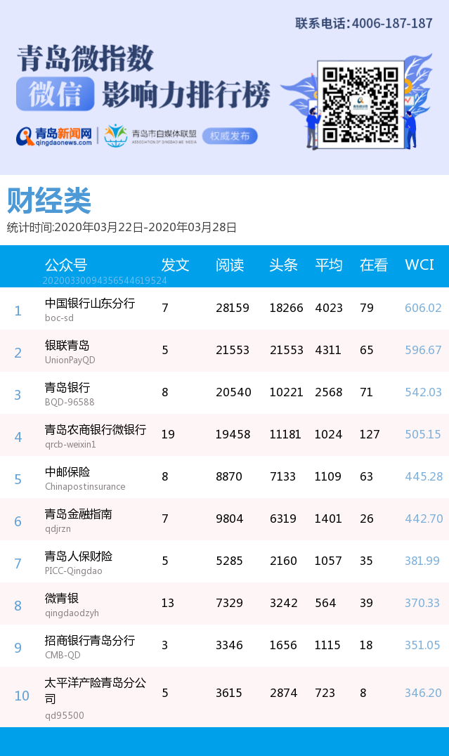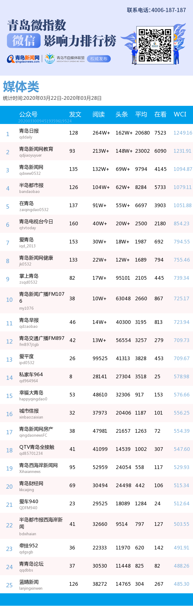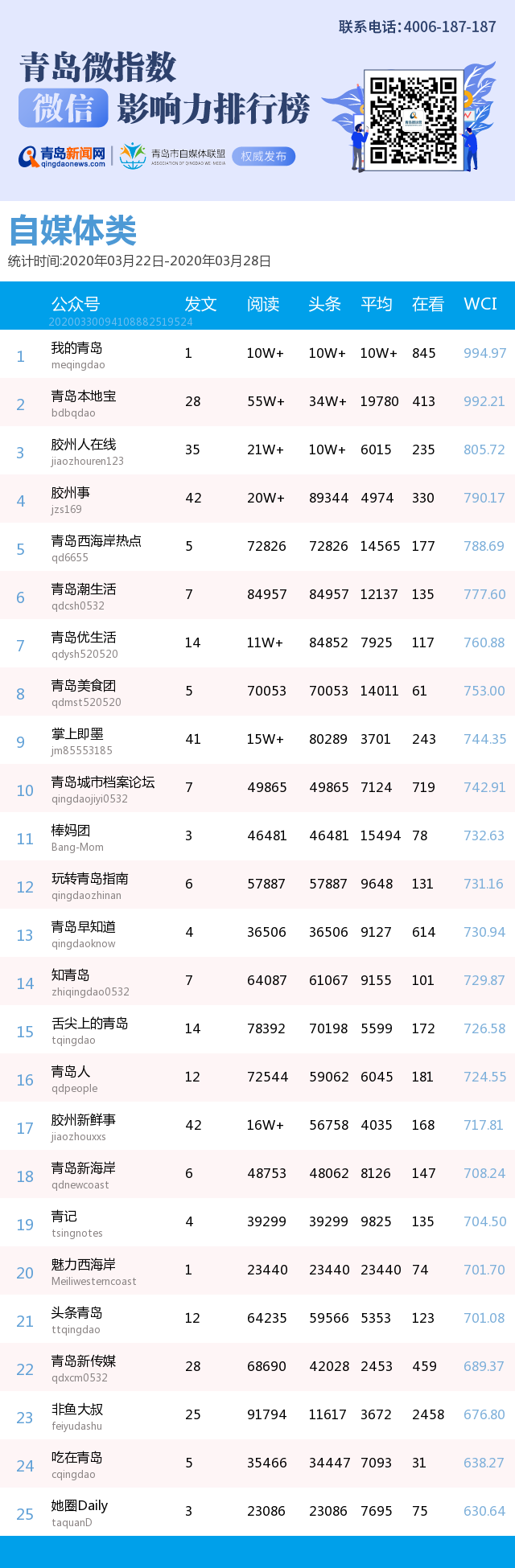 青島新聞網(wǎng)3月30日訊(記者 邢書玲)由青島新聞網(wǎng)打造的“青島微指數(shù)微信影響力排行榜”今日發(fā)布一周(2020年3月22日-2020年3月28日)榜單。