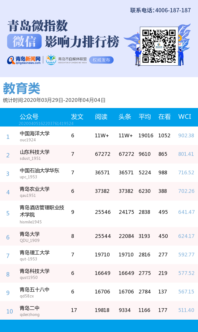 【微信】青島微指數(shù)微信影響力排行榜(3月29日-4月4日)“山東開學時間公布”引關注 “即墨教育”成本期黑馬