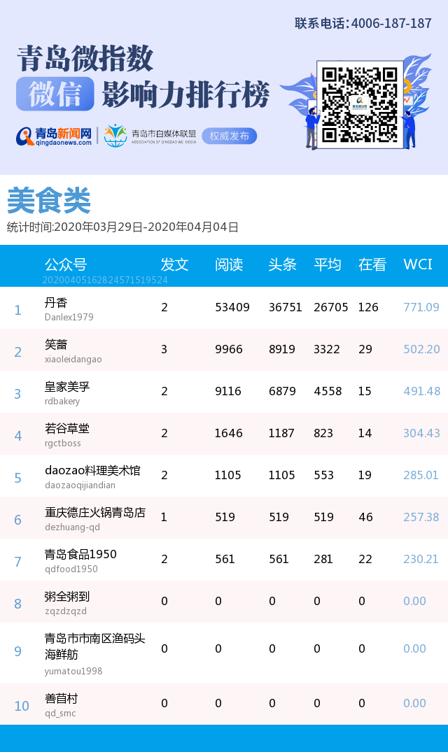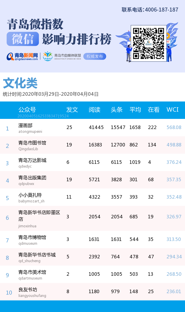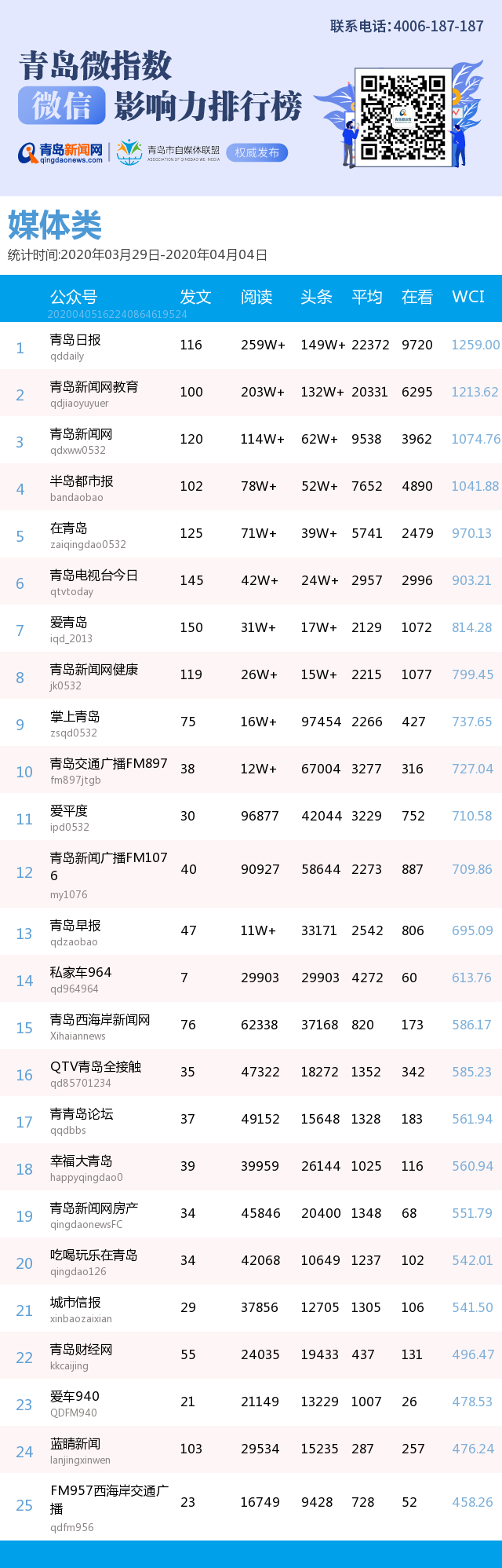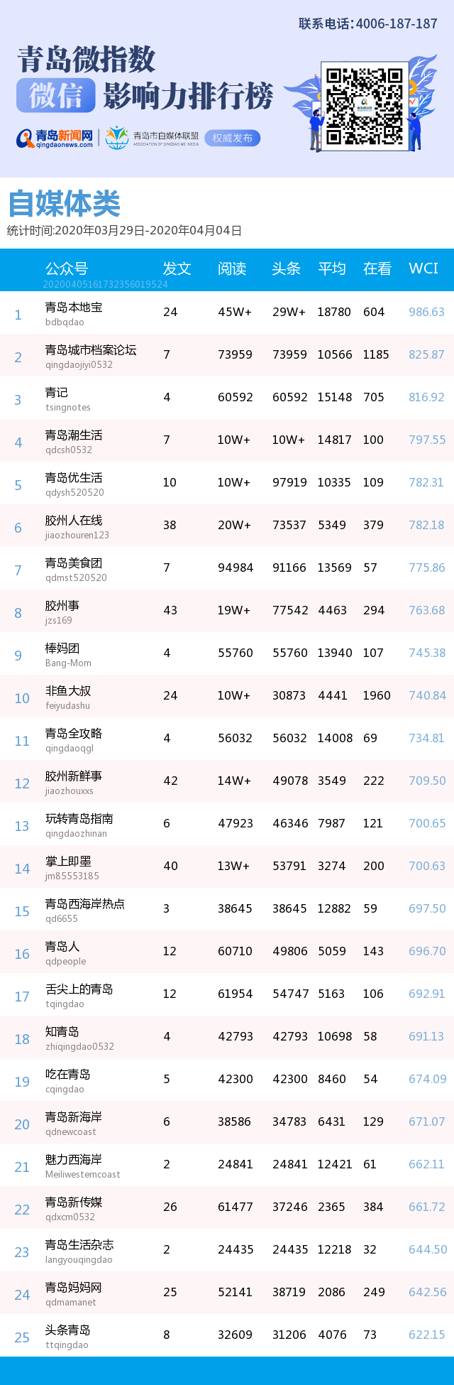 青島新聞網(wǎng)4月6日訊(記者 邢書玲)由青島新聞網(wǎng)打造的“青島微指數(shù)微信影響力排行榜”今日發(fā)布一周(2020年3月29日-2020年4月4日)榜單。
