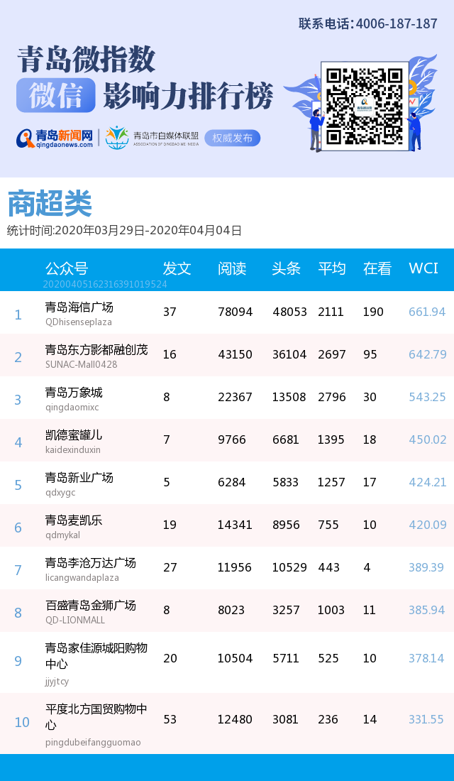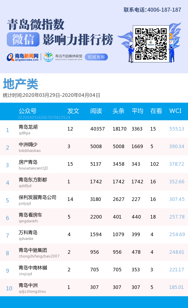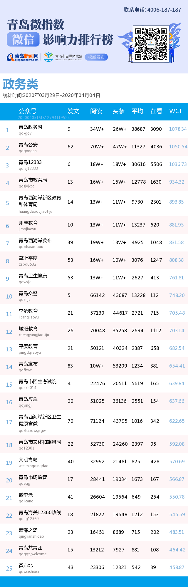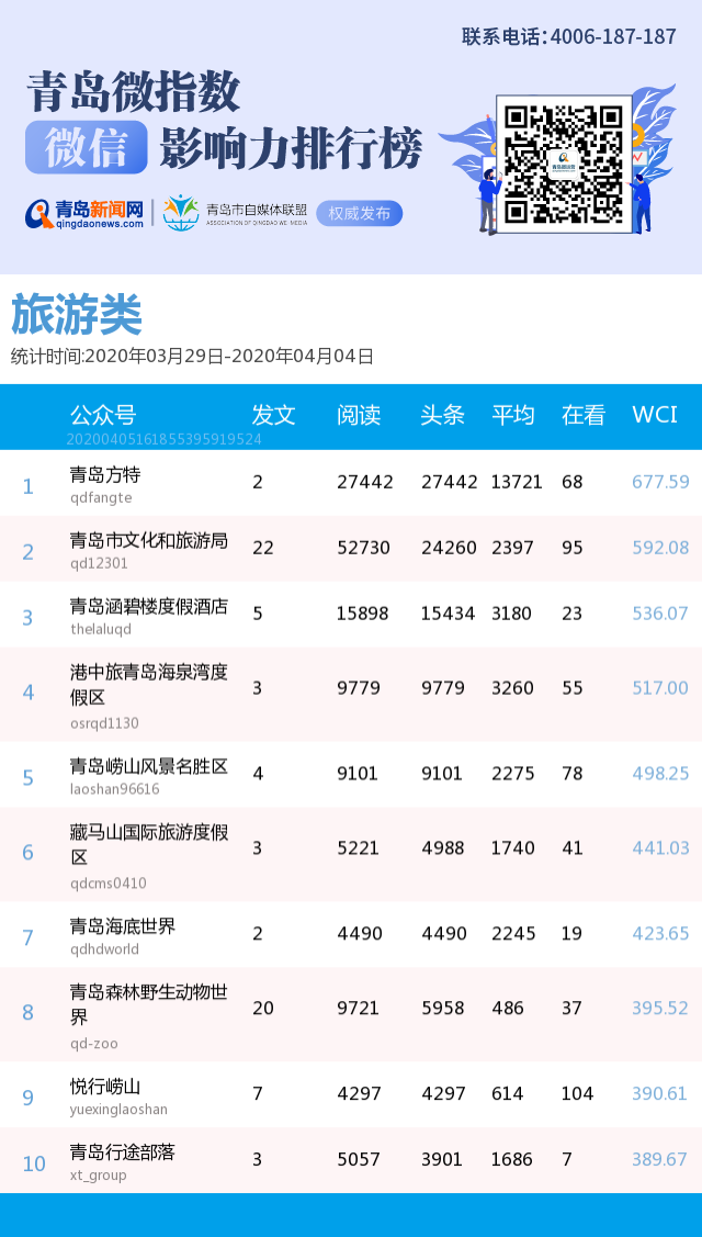 3、本次榜單收錄了青島14個行業(yè)微信公眾號,如您的賬號暫未收錄,可聯(lián)系4006-187-187。