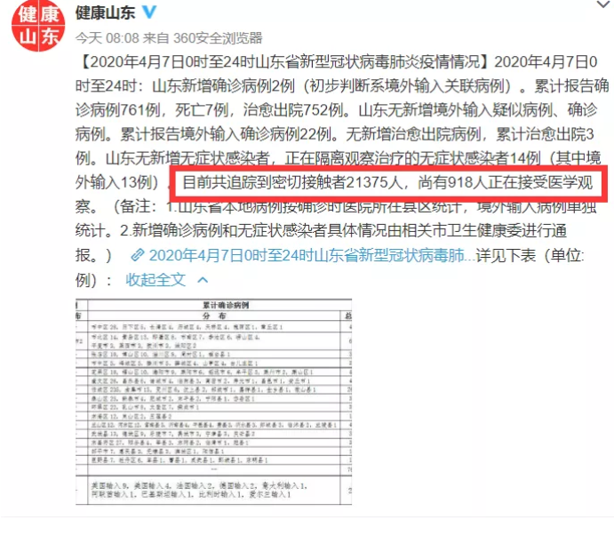 根據(jù)山東省衛(wèi)生健康委官方微博“@健康山東”發(fā)布的信息(下圖),目前全省共追蹤到密切接觸者21375人,尚有918人正在接受醫(yī)學(xué)觀察。此數(shù)據(jù)為整個山東省截止4月7日24時的數(shù)據(jù),并非膠州市。