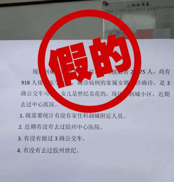 近日,抖音、微信群、微博等平臺出現(xiàn)了大量與膠州兩名確診病例相關(guān)的信息,其中存在不少謠言。下面,小編根據(jù)膠州市衛(wèi)生健康局提供的相關(guān)信息,給大家一一指出其中錯誤: