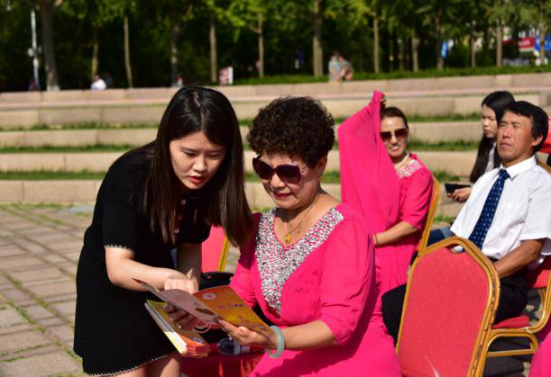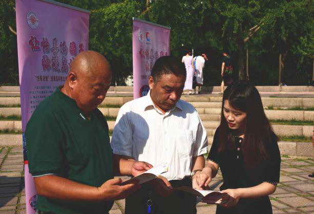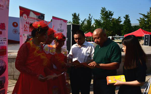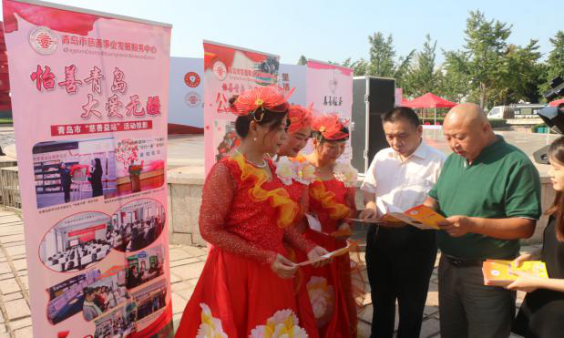青島市慈善事業(yè)發(fā)展服務(wù)中心工作人員向市民發(fā)放《慈善法》宣傳折頁(yè)并為他們答疑釋惑