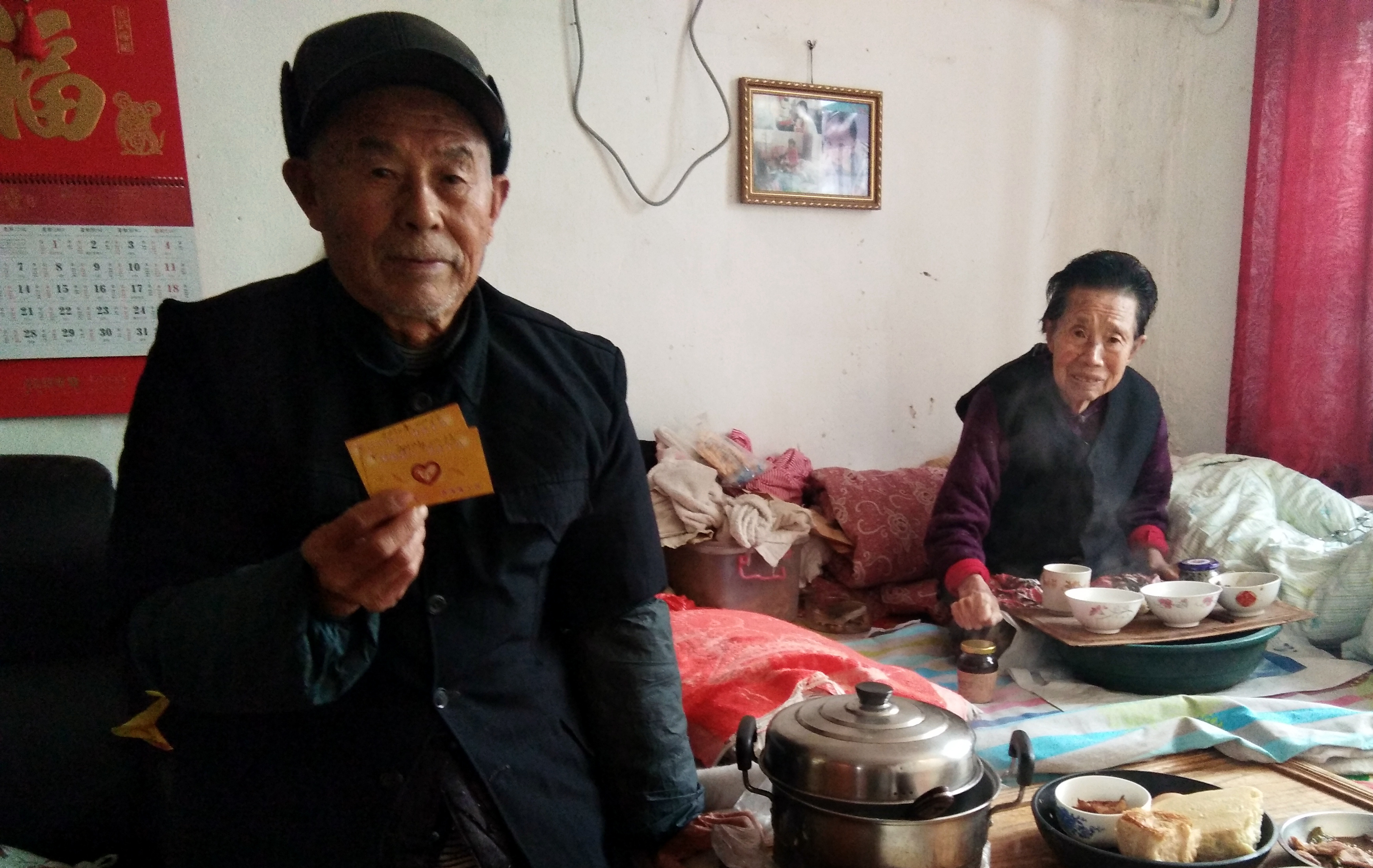 村民拿到和老伴的兩張蛋糕票,高興地向人展示
