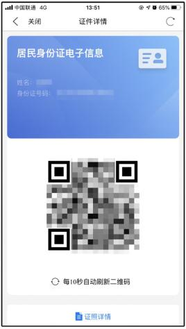(3)完成實(shí)名認(rèn)證后可重新進(jìn)入“身份證電子信息”功能,完成人臉識(shí)別信息確認(rèn),即可生成個(gè)人身份證電子信息。使用時(shí),可以打開(kāi)網(wǎng)證二維碼,通過(guò)掃一掃證明自己的身份,點(diǎn)擊“證照詳情”即可顯示身份信息。