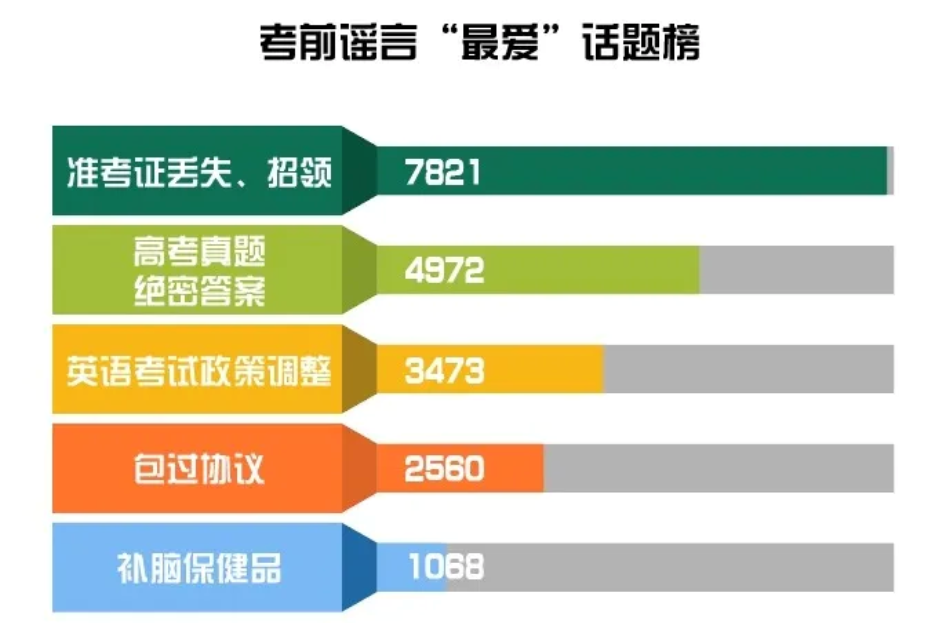 丟準(zhǔn)考證事件每年都有發(fā)生,一方面讓信息真假難辨,迷惑性強(qiáng),不少網(wǎng)民正出于善于轉(zhuǎn)發(fā),給了謠言可乘之機(jī);另一方面,其較高的出現(xiàn)頻率、舊謠新傳等特點(diǎn),也為識(shí)謠辨謠提供了契機(jī)。中國互聯(lián)網(wǎng)聯(lián)合辟謠平臺(tái)對近3年此類謠言進(jìn)行梳理,歸納出此類謠言高頻詞,看到它們,就別轉(zhuǎn)了!