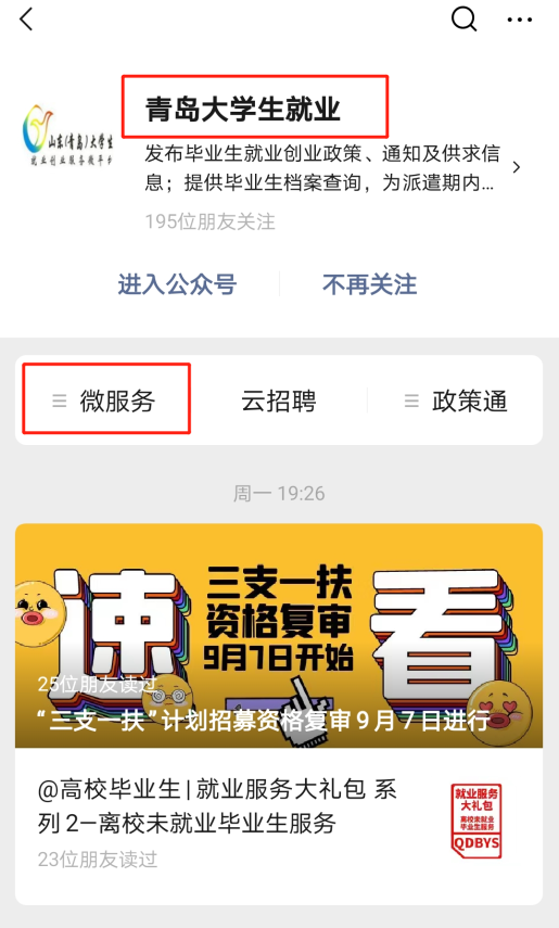 2.可關(guān)注“青島大學(xué)生就業(yè)”微信公眾號(hào),在“微服務(wù)”選擇“檔案查詢”;