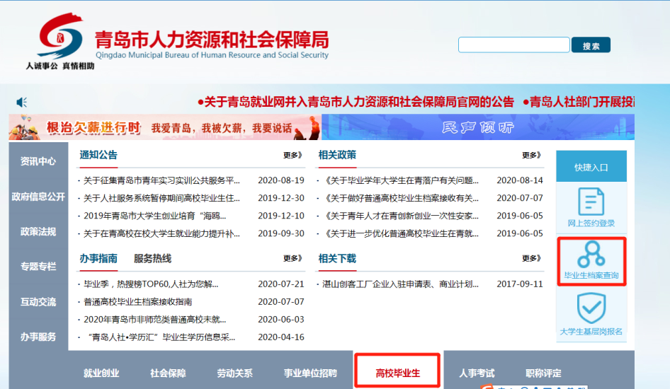 1.可登錄青島市人力資源和社會(huì)保障局官方網(wǎng)站,進(jìn)入“高校畢業(yè)生”模塊,右側(cè)“畢業(yè)生檔案”窗口查詢;