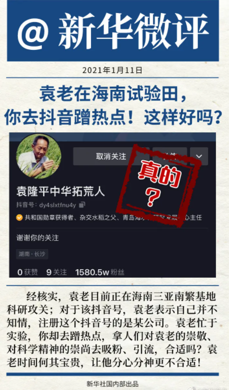 袁隆平入駐抖音?本人不知情!