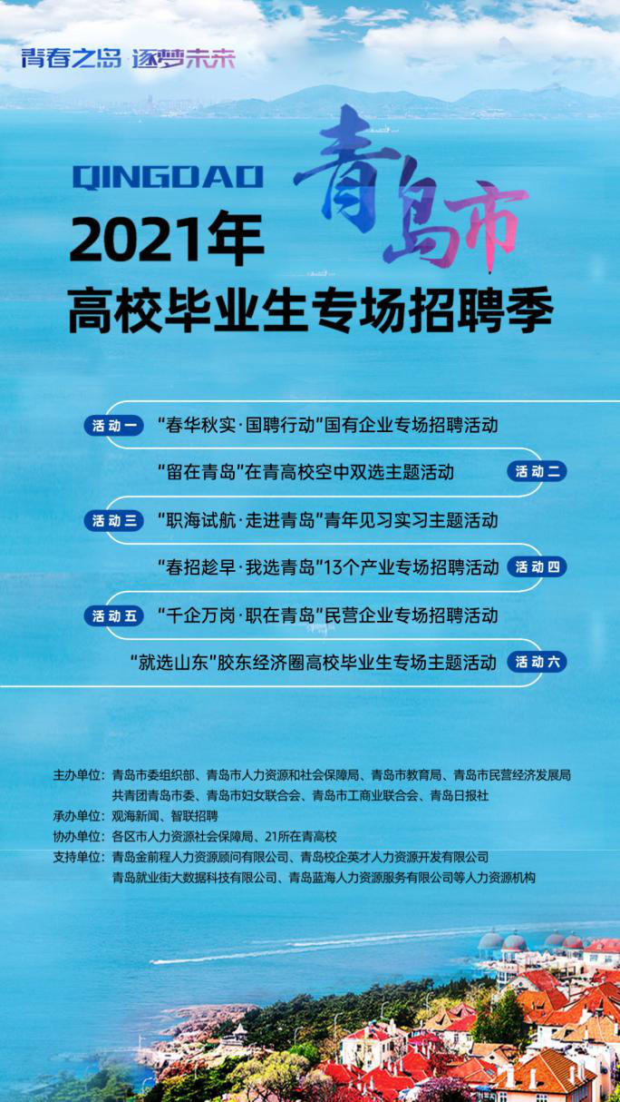 青島新聞網2月24日訊 2021年2月23日,“青春之島·逐夢未來”2021年青島市高校畢業(yè)生專場招聘季活動在全球253.5萬人共同在線見證下,正式啟動。接下來的98天,招聘季將根據(jù)海內外高校畢業(yè)生、在校生的不同求職特點,通過線上線下招聘、實習見習對接、企業(yè)走訪觀摩、政策宣講解讀、職業(yè)規(guī)劃指導等形式、陸續(xù)開展“春華秋實·國聘行動”國有企業(yè)專場招聘活動、“留在青島”在青高??罩须p選活動、“職海試航·走進青島”青年見習實習活動、“春招趁早·我選青島”13個產業(yè)專場招聘活動、“千企萬崗·職在青島”民營企業(yè)專場招聘活動、“就選山東”膠東經濟圈高校畢業(yè)生招聘六大主題活動。