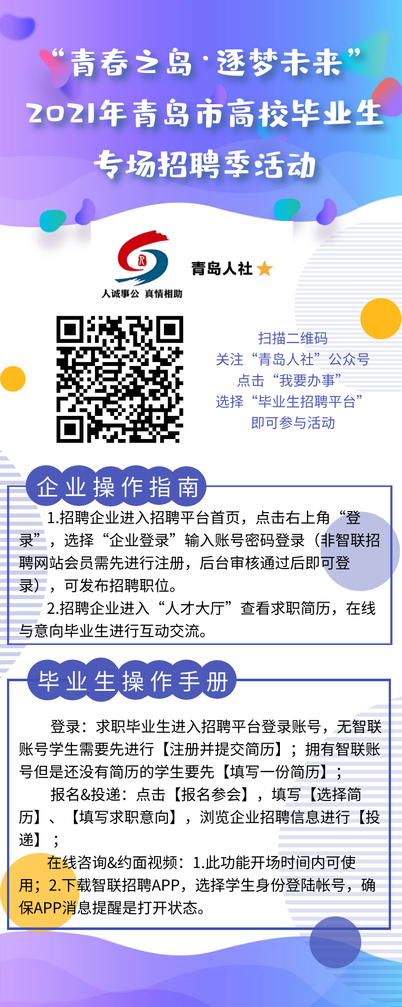 有意向參加招聘活動的用人單位和高校畢業(yè)生可掃描下方二維碼關注“青島人社”微信公眾號,進入青島市高校畢業(yè)生網絡招聘平臺參加招聘會。