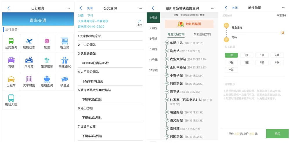 “便民生活專區(qū)”位于青e辦APP首頁的專區(qū)服務(wù)詳情頁,服務(wù)范圍涵蓋了市民日常生活的方方面面。 其中交通出行類服務(wù)匯集了公交查詢、地鐵購票、慧停車+、出行服務(wù)、ETC服務(wù)、地鐵線路查詢,為市民日常通勤出行、長短途旅游提供全方位出行服務(wù)。公交查詢可以提供公交線路到站情況實(shí)時查詢,是幫助市民合理安排線路中轉(zhuǎn)、有效躲避擁堵的等車神器。地鐵購票能實(shí)現(xiàn)APP內(nèi)在線購票,市民選擇要乘坐的地鐵線路和起始站點(diǎn)后,就可以通過支付寶支付的方式完成提前購票,無需到地鐵站點(diǎn)內(nèi)排隊(duì)購買單次行程票。出行服務(wù)應(yīng)用提供航班動態(tài)實(shí)時查詢、輪渡航線信息、高速路況、出租車、火車時刻、船期信息、機(jī)場大巴查詢。此外,青島的客運(yùn)站、駕校、汽修站和旅游信息等也可以在該應(yīng)用內(nèi)查詢到。