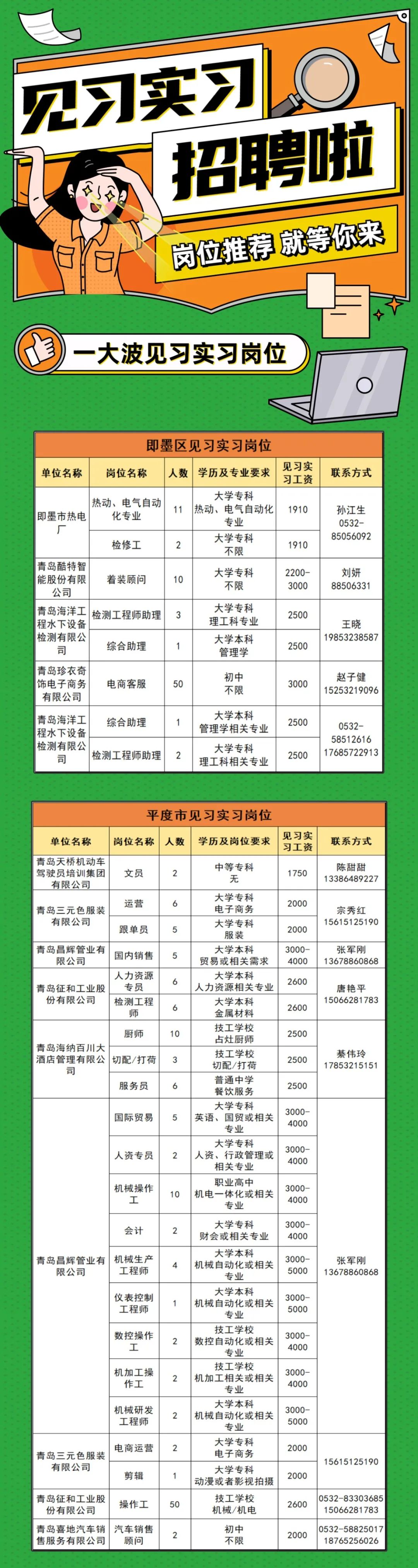 即墨區(qū)、平度市、萊西市見習(xí)實(shí)習(xí)崗位推薦來啦!