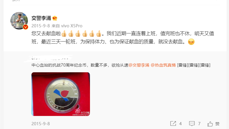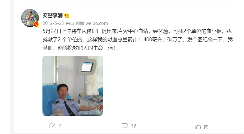 2015年9月8日,一位網(wǎng)友在微博上關(guān)心地詢問,“您又去獻(xiàn)血啦。”李涌答復(fù):“我們近期一直連著上班,值完班也不休,明天又值班,最近三天一輪班,為保持體力、也為保證獻(xiàn)血的質(zhì)量,就沒去獻(xiàn)血?!痹谖⒉┌l(fā)布后不久,李涌又去獻(xiàn)血了,在微博中記錄道:“用自己的熱血,幫助更多需要的人延續(xù)生命,早日恢復(fù)健康,保全他們完整團(tuán)圓的家?!?/p>