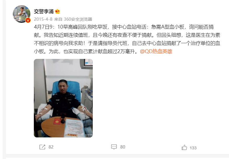 趙會(huì)霞講的這件事,李涌同樣記錄在微博上,他記錄了當(dāng)時(shí)接到電話后的所感所想。2015年4月8日,李涌在微博中寫道:“4月7日9點(diǎn)10分早高峰回隊(duì)剛吃早飯,接中心血站電話:急需A型血小板,詢問我能否捐獻(xiàn)。我告知近期連續(xù)值班,且今晚還有夜查不便于捐獻(xiàn)。但回頭細(xì)想,這是醫(yī)生在為素不相識(shí)的病號(hào)向我求助!于是請(qǐng)指導(dǎo)員代班,自己去中心血站捐獻(xiàn)了一個(gè)治療單位的血小板。為此,也實(shí)現(xiàn)自己累計(jì)獻(xiàn)血超過2萬(wàn)毫升?!?/p>