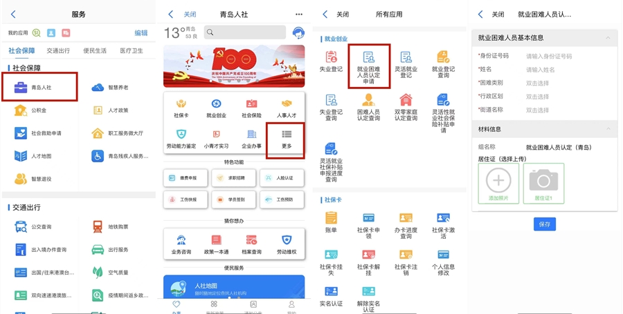 符合上述條件的人員除可登錄市人社局官網(wǎng)線上申請(qǐng),也可向任一街道(鎮(zhèn))人力資源和社會(huì)保障服務(wù)中心提出就業(yè)困難人員認(rèn)定申請(qǐng)?,F(xiàn)在,就業(yè)困難人員可登錄“愛山東·青e辦”APP,簡(jiǎn)單操作兩步,實(shí)現(xiàn)掌上認(rèn)定申請(qǐng)。首先,在“愛山東?青e辦”APP首頁(yè)頂端搜索欄搜索“青島人社”服務(wù)或點(diǎn)擊首頁(yè)更多-社會(huì)保障-青島人社;然后,在應(yīng)用詳情頁(yè)點(diǎn)擊更多找到“就業(yè)創(chuàng)業(yè)”模塊,點(diǎn)擊“就業(yè)困難人員認(rèn)定申請(qǐng)”進(jìn)入詳情頁(yè)后根據(jù)要求填寫信息后提交申請(qǐng)即可。申請(qǐng)?zhí)峤缓?,如需查看審核結(jié)果,可點(diǎn)擊“困難人員認(rèn)定查詢”進(jìn)行查看。