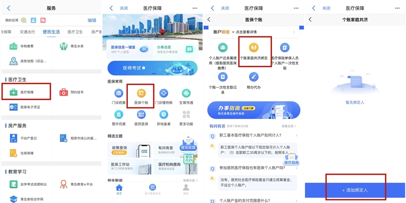 需要注意的是,職工醫(yī)保個人賬戶家庭共濟使用,必須將家庭成員醫(yī)保電子憑證激活關聯(lián)后方可使用,關聯(lián)的近親屬數(shù)量最多不超過7個。“愛山東·青e辦”中只需操作三步,即可進行醫(yī)保個人賬戶家庭共濟綁定。首先,在APP首頁服務推薦欄點擊“更多”,進入服務詳情頁,在醫(yī)療衛(wèi)生分類下,找到“醫(yī)療保障”點擊進入。第二步,在“醫(yī)保個賬”服務詳情頁選擇“個賬家庭共濟綁定”。第三步,在個賬家庭共濟綁定頁面點擊“添加綁定人”,填寫需要綁定的親屬信息,即可完成綁定。綁定后即時生效,已經綁定的參保人在定點醫(yī)藥機構就醫(yī)購藥時,可通過掃描醫(yī)保電子憑證消費職工參保人的醫(yī)保個人賬戶金。