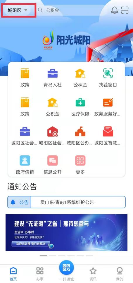 1、打開“愛山東·青e辦”APP,進入首頁,左上角點擊切換至城陽分廳;
