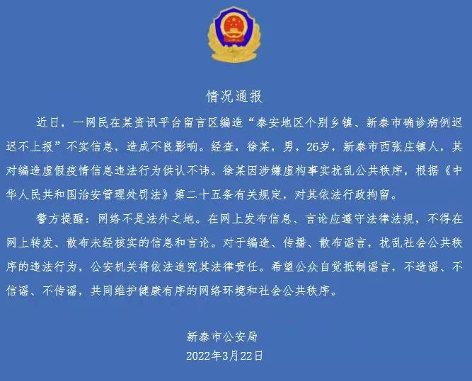 經(jīng)查,徐某,男,26歲,新泰市西張莊鎮(zhèn)人,其對(duì)編造虛假疫情信息違法行為供認(rèn)不諱。