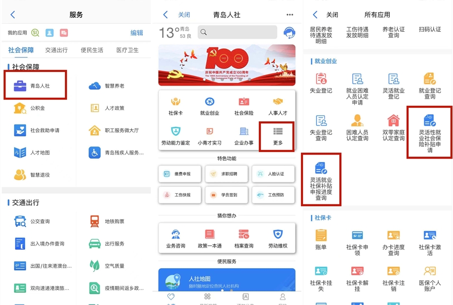 滿足條件的靈活就業(yè)人員只需在“愛(ài)山東·青e辦”首頁(yè)服務(wù)詳情頁(yè)的“社會(huì)保障”分類下,找到“青島人社”服務(wù)點(diǎn)擊進(jìn)入,在“就業(yè)創(chuàng)業(yè)”模塊下找到“靈活性就業(yè)社會(huì)保險(xiǎn)補(bǔ)貼申請(qǐng)”點(diǎn)擊進(jìn)入詳情頁(yè),填寫信息并上傳所需材料,即可進(jìn)行申報(bào)。申報(bào)成功后,還可通過(guò)“靈活就業(yè)社保補(bǔ)貼申報(bào)進(jìn)度查詢”服務(wù),查詢辦理進(jìn)度。