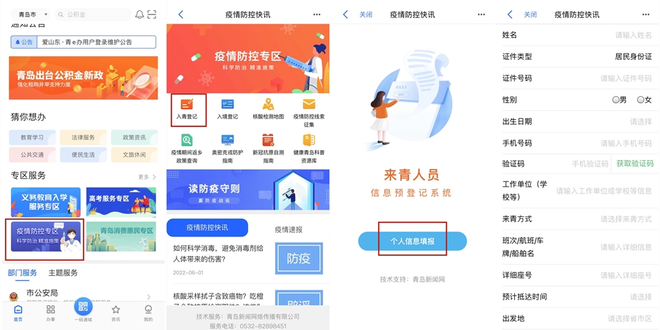 相關(guān)人員來青返青后,除第一時間主動向所在社區(qū)(村居)或企業(yè)(單位)報到外,還要登錄“青島市入境人員信息系統(tǒng)”或“來青人員預登記系統(tǒng)”,如實申報登記有關(guān)信息。計劃來青返青的入境人員,由其親友或其親友告知本人提前72小時登錄“青島市入境人員信息系統(tǒng)”,如實申報登記有關(guān)信息。入青返青人員可在“愛山東?青e辦”直接進行信息申報,步驟如下。
