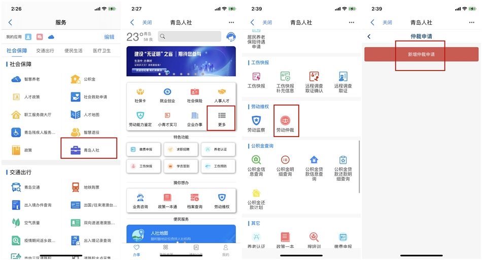 首先,在“愛山東·青e辦”APP“服務(wù)”詳情頁找到社會保障分類下的“青島人社”應(yīng)用;然后,在應(yīng)用詳情頁的“勞動維權(quán)”欄目下,找到“勞動仲裁”模塊,最后點(diǎn)擊進(jìn)入詳情頁后點(diǎn)擊“新增仲裁申請”,根據(jù)頁面要求填寫、提交相關(guān)材料,填寫完成后,點(diǎn)擊提交,閱讀注意事項(xiàng)后,點(diǎn)擊確認(rèn)即可完成在線申請。