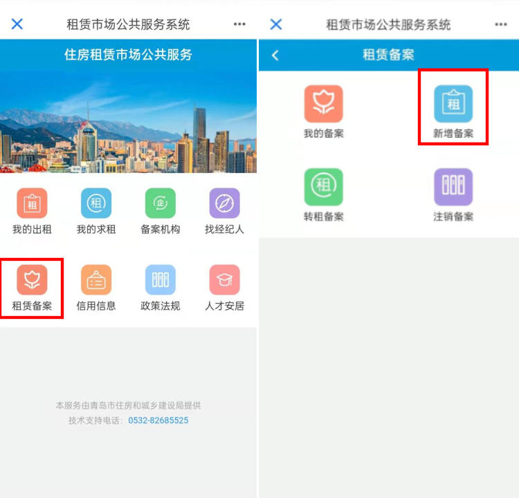2、進入“住房租賃市場公共服務”應用,點擊“租賃備案”——“新增備案”,根據(jù)頁面指引填寫信息,即可完成租賃備案。