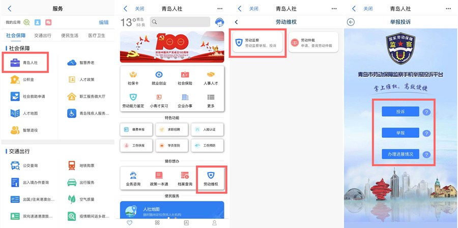 現(xiàn)在,勞動者可以選擇一種更加便捷的勞動維權(quán)方式——“愛山東·青e辦”APP,只需一部手機(jī),勞動維權(quán)不再受時間、地點(diǎn)限制,足不出戶或本人不在青島也能隨時隨地提交舉報投訴申請。勞動者可下載注冊“愛山東·青e辦”APP,只需三步,即可完成指尖投訴。首先,在“愛山東·青e辦”APP“服務(wù)”詳情頁找到社會保障分類下的“青島人社”應(yīng)用;然后,在應(yīng)用詳情頁的“勞動維權(quán)”欄目下,找到“勞動監(jiān)察”,最后點(diǎn)擊進(jìn)入詳情頁后根據(jù)需要選擇投訴、舉報。投訴舉報完成后,還可點(diǎn)擊辦理進(jìn)展情況按鈕,查詢辦理進(jìn)度。