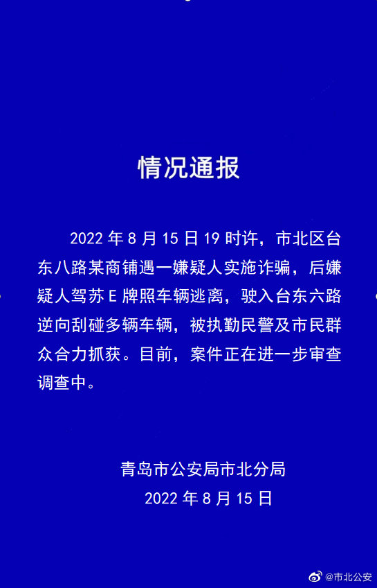 山東青島市北分局通報:8月15日19時許,某商鋪遇一嫌疑人實(shí)施詐騙。后嫌疑人駕車逃離逆向刮碰多車,被執(zhí)勤民警及市民群眾合力抓獲。目前,案件正在進(jìn)一步審查調(diào)查中。