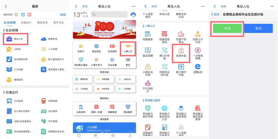 以往高校畢業(yè)生住房補(bǔ)貼申請(qǐng)人須通過青島人才網(wǎng)或到用人單位或創(chuàng)業(yè)實(shí)體注冊(cè)登記地所在區(qū)(市)人力資源社會(huì)保障部門現(xiàn)場(chǎng)辦理,現(xiàn)在,補(bǔ)貼申請(qǐng)又添新渠道。申請(qǐng)人可在“愛山東·青e辦”APP內(nèi)的青島人社應(yīng)用內(nèi)直接申請(qǐng)。首先,在“愛山東·青e辦”APP“服務(wù)”詳情頁(yè)找到社會(huì)保障分類下的“青島人社”應(yīng)用;然后,在應(yīng)用詳情頁(yè)的“人事人才”欄目下,找到“住房補(bǔ)貼”,進(jìn)入詳情頁(yè)后點(diǎn)擊申請(qǐng)即可進(jìn)行住房補(bǔ)貼申請(qǐng)。申請(qǐng)完成后,還可點(diǎn)擊查詢按鈕,進(jìn)行已申請(qǐng)的補(bǔ)貼項(xiàng)目信息查詢。
