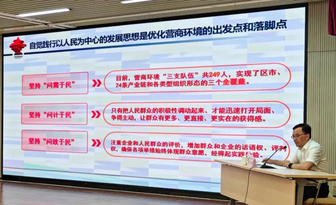 趙發(fā)海同志結(jié)合學(xué)習(xí)心得和前期調(diào)研情況,重點從三個方面展開詳細(xì)的闡述,為全局黨員、干部深入開展學(xué)習(xí)貫徹習(xí)近平新時代中國特色社會主義思想主題教育提供了具體行動指導(dǎo)。一是在學(xué)深悟透習(xí)近平總書記關(guān)于優(yōu)化營商環(huán)境重要論述上下功夫。堅持黨的領(lǐng)導(dǎo)是優(yōu)化營商環(huán)境的根本保證,自覺踐行以人民為中心的發(fā)展思想是優(yōu)化營商環(huán)境的出發(fā)點和落腳點,處理好政府與市場關(guān)系是優(yōu)化營商環(huán)境的關(guān)鍵所在,深化改革創(chuàng)新是優(yōu)化營商環(huán)境的源頭活水。二是在認(rèn)清優(yōu)化營商環(huán)境面臨的新形勢新任務(wù)上出實招。要充分認(rèn)識國內(nèi)外復(fù)雜形勢給優(yōu)化營商環(huán)境帶來的巨大壓力,深入挖掘和激發(fā)新時代優(yōu)化營商環(huán)境所蘊藏的無窮潛力,在新征程上立足本職,實現(xiàn)優(yōu)化營商環(huán)境新突破。三是在立足審批服務(wù)實踐打造一流營商環(huán)境上求實效。要堅持以干成事論英雄、以解決實際問題論能力,以高質(zhì)量發(fā)展項目論業(yè)績,把抓工作落實當(dāng)作全局工作的生命線,錘煉一流作風(fēng)、鍛造一流隊伍、鑄就一流事業(yè),重點開展好七項行動:黨建品牌擦亮行動、作風(fēng)能力提升行動、營商環(huán)境攻堅行動、政務(wù)服務(wù)增值行動、數(shù)字賦能深化行動、意見建議清零行動、自我革新提高行動。