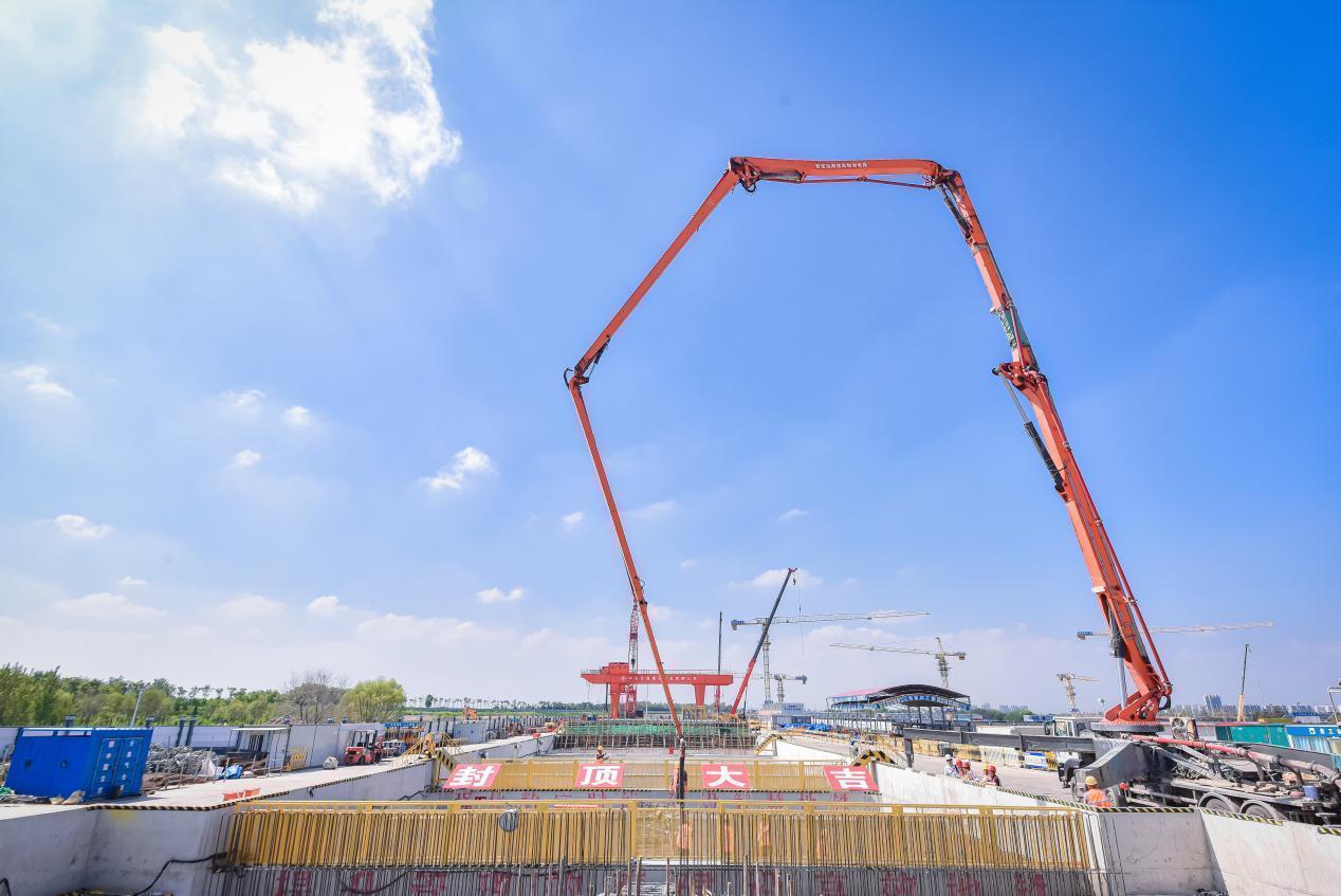 該站基坑土石方開挖總量約55萬立方米,車站建筑面積近5萬平方米,主體結(jié)構(gòu)中,混凝土用量達(dá)9萬立方米,鋼材用量1.8萬噸。閆家山站自2022年4月15日進(jìn)入主體結(jié)構(gòu)施工,至順利完成封頂,比計(jì)劃提前了40天。