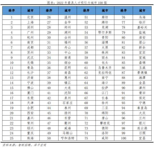在近日由智聯(lián)招聘聯(lián)合澤平宏觀發(fā)布的2022年最具人才吸引力城市100強(qiáng)榜單中,青島位居11位,是前12名中除北京之外惟一的北方城市。據(jù)發(fā)布方分析,2022年我國應(yīng)屆生、碩士及以上人才將簡歷投向一線城市的占比為20.7%、26.8%,他們向一二線城市特別是一線城市集聚的趨勢(shì)越來越明顯。與之呼應(yīng)的是,青島市公布的自2012年以來的人才家底顯示:截至2022年上半年,青島全市人才總量突破257萬人。十年間,全市人才總量約增加110萬人。其中,新增住青院士17人,總數(shù)達(dá)到85人;新增國家級(jí)人才364人,增長140%。