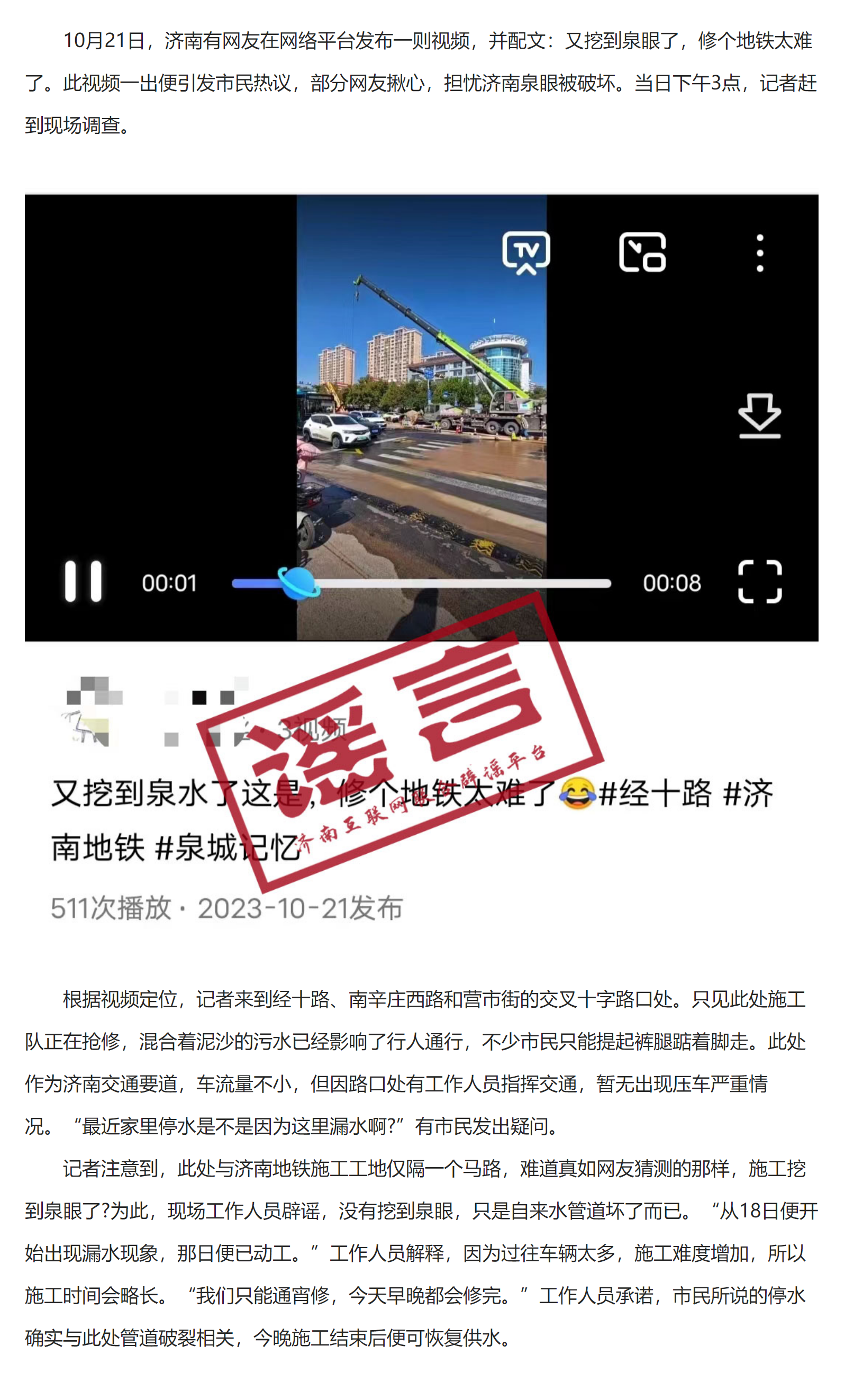 濟(jì)南地鐵施工遇泉眼?施工人員:自來(lái)水管道壞了而已