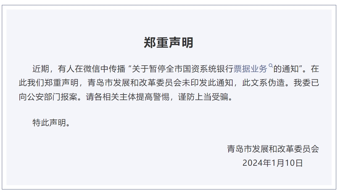 暫停全市國(guó)資系統(tǒng)銀行票據(jù)業(yè)務(wù)?青島發(fā)改委辟謠:此文系偽造!