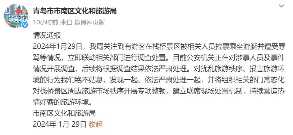 2024年1月29日,我局關(guān)注到有游客在棧橋景區(qū)被相關(guān)人員拉票乘坐游艇并遭受辱罵等情況,立即聯(lián)動(dòng)相關(guān)部門進(jìn)行調(diào)查處置。目前公安機(jī)關(guān)正在對(duì)涉事人員及事件情況開展調(diào)查,后續(xù)將根據(jù)調(diào)查結(jié)果依法嚴(yán)肅處理。對(duì)擾亂旅游秩序、損害旅游環(huán)境的行為我們絕不姑息,發(fā)現(xiàn)一起、依法嚴(yán)肅處理一起,并將組織相關(guān)部門常態(tài)化對(duì)棧橋景區(qū)周邊旅游市場秩序開展專項(xiàng)整頓,建立聯(lián)席現(xiàn)場處置機(jī)制,持續(xù)營造熱情好客的旅游環(huán)境。
