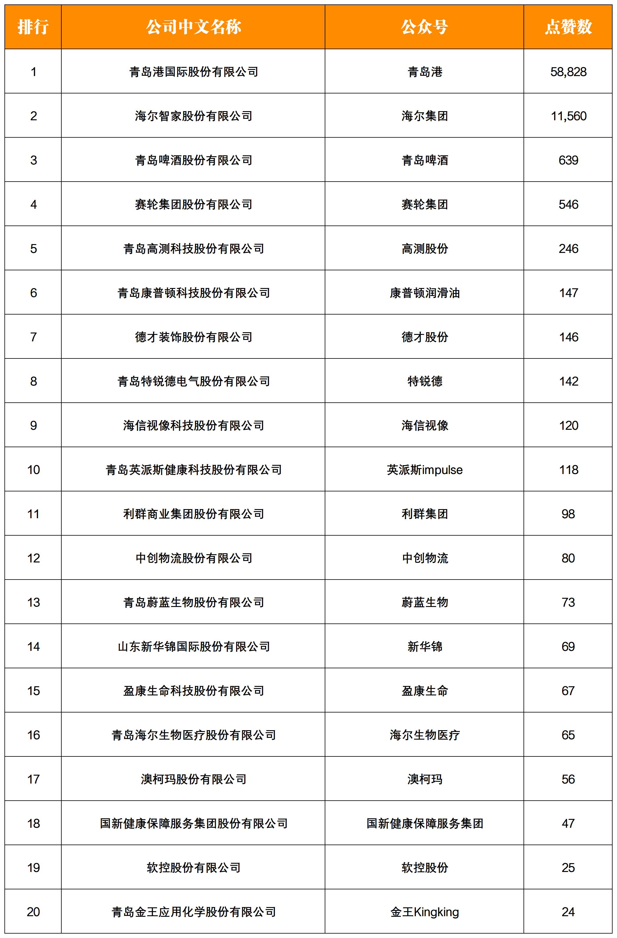 本期登上分榜單總點(diǎn)贊數(shù)前三的青島上市企業(yè)是:“青島港”、“海爾集團(tuán)”、“青島啤酒”。