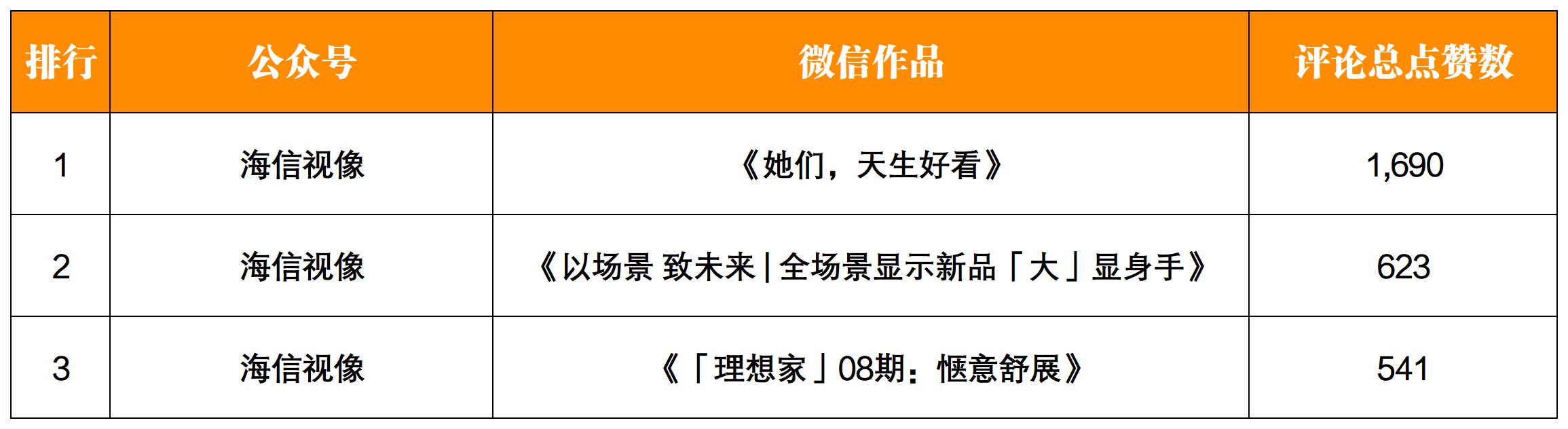 本期單篇作品最高評(píng)論總點(diǎn)贊數(shù)1690,出自賬號(hào)“海信視像”的《她們,天生好看》一文;排行第二、第三也均出自賬號(hào)“海信視像”的《以場(chǎng)景 致未來(lái) | 全場(chǎng)景顯示新品「大」顯身手》一文和《「理想家」08期:愜意舒展》一文,評(píng)論總點(diǎn)贊數(shù)分別是623和541。