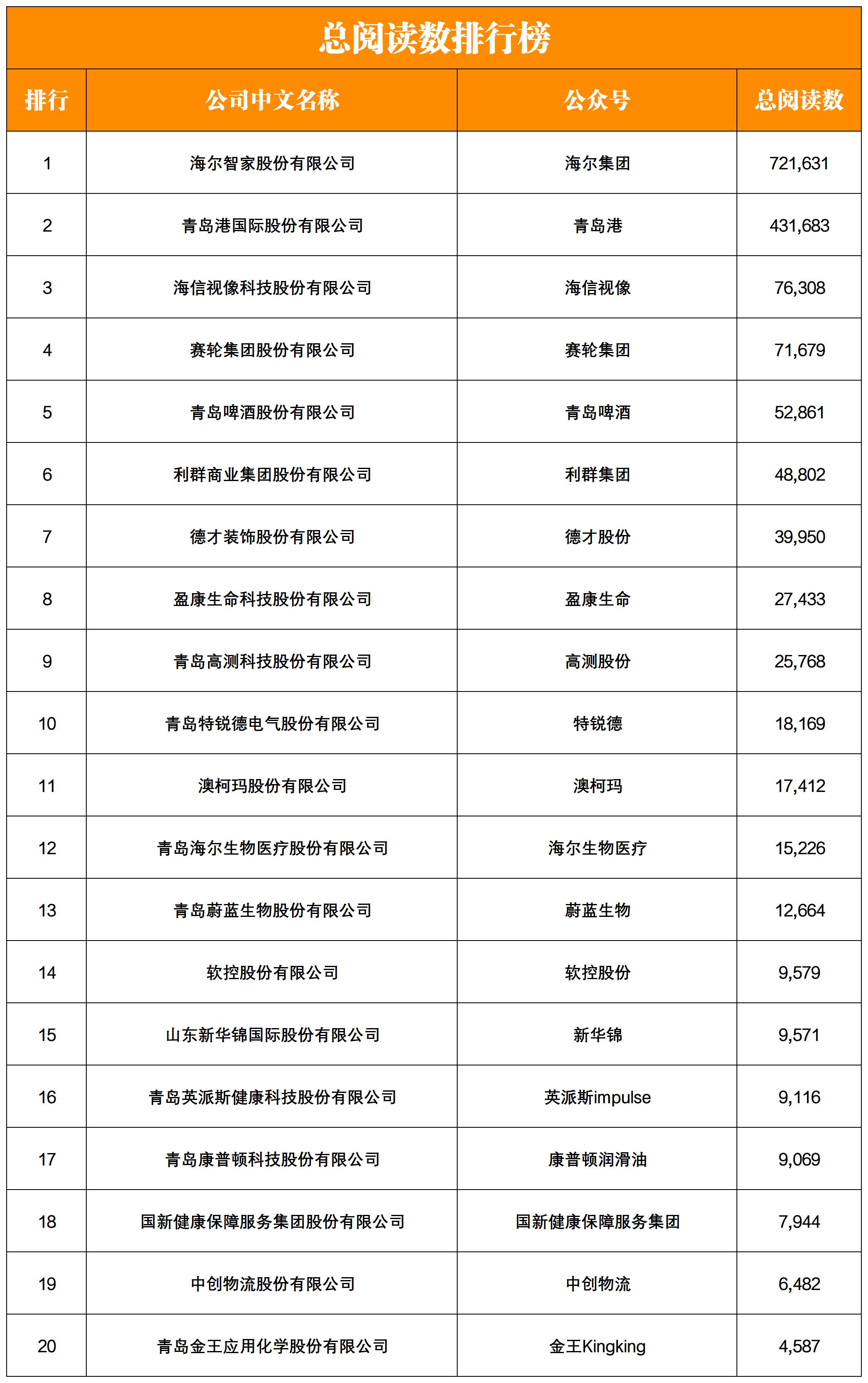 NO.3| 權(quán)威發(fā)布:青島上市企業(yè)微信影響力月度排行榜TOP20