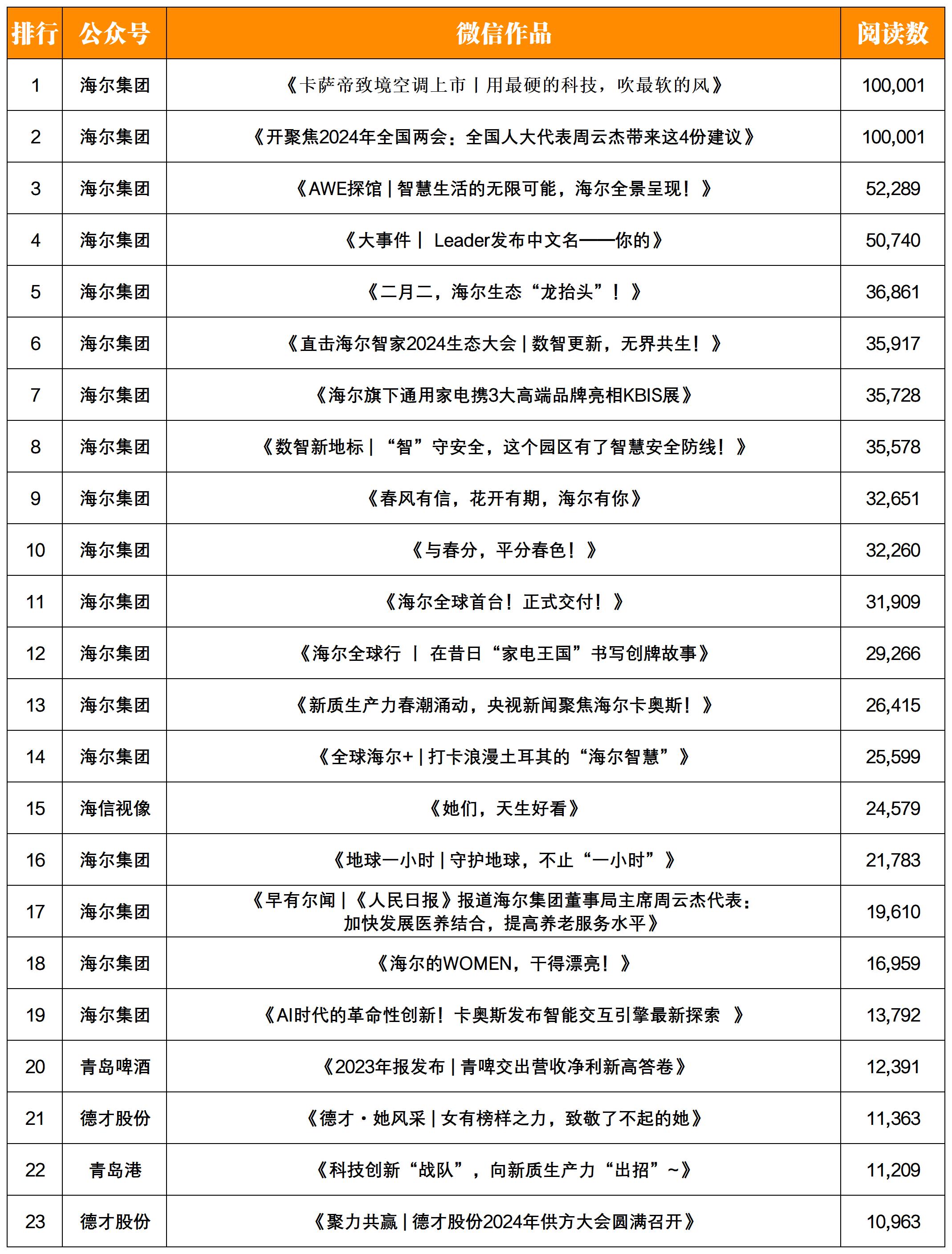 熱文方面,“海爾集團(tuán)”的《卡薩帝致境空調(diào)上市丨用最硬的科技,吹最軟的風(fēng)》和《聚焦2024年全國(guó)兩會(huì):全國(guó)人大代表周云杰帶來(lái)這4份建議》兩篇文章均喜提10w+閱讀。