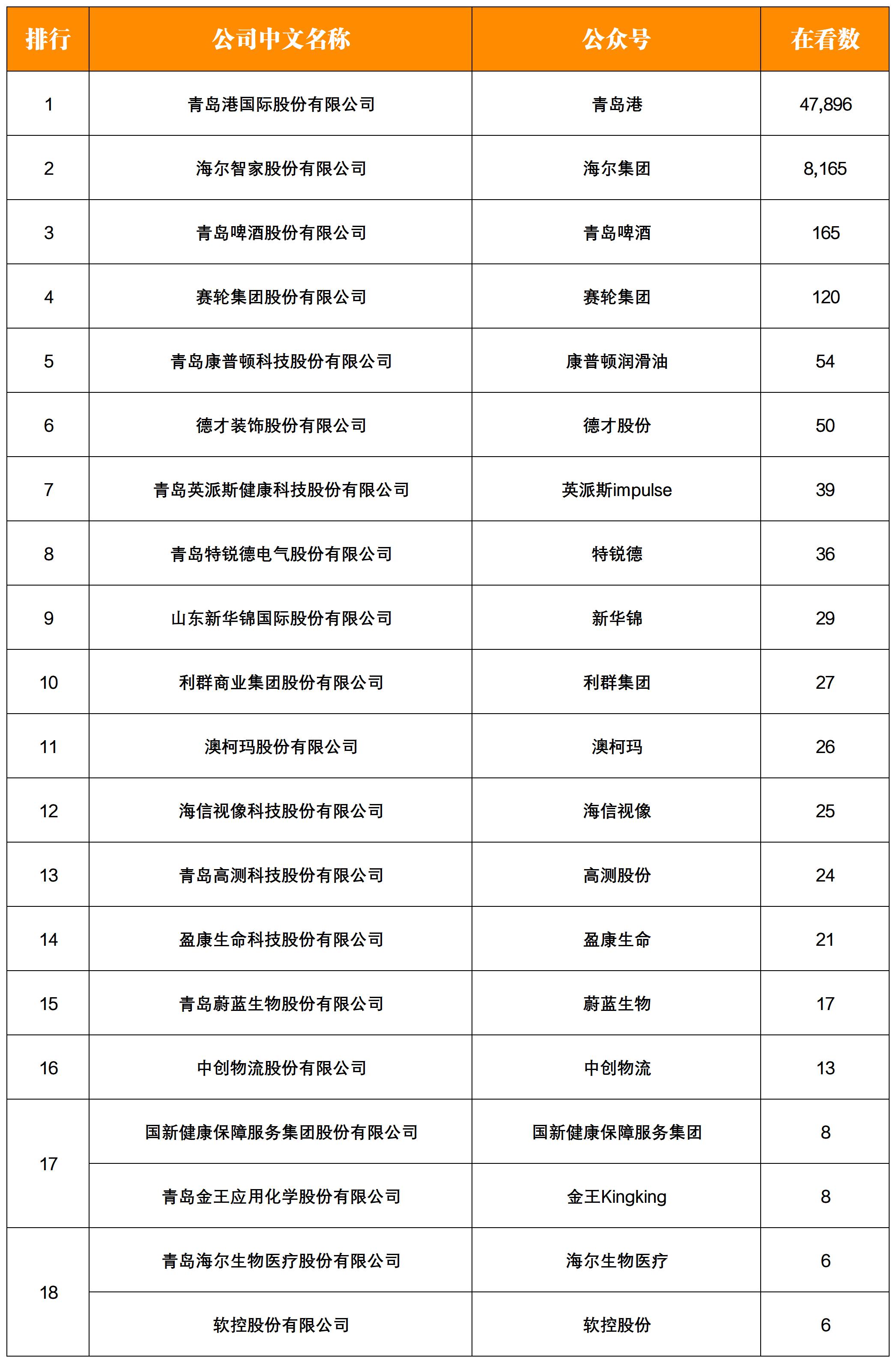 本期登上分榜單總在看數(shù)前三的青島上市企業(yè)是:“青島港”、“海爾集團(tuán)”、“青島啤酒”。