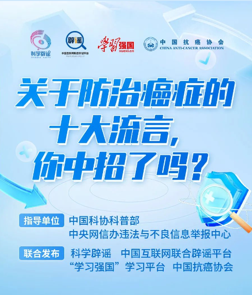 今天,科學(xué)辟謠聯(lián)合中國(guó)互聯(lián)網(wǎng)聯(lián)合辟謠平臺(tái)、“學(xué)習(xí)強(qiáng)國(guó)”學(xué)習(xí)平臺(tái)、中國(guó)抗癌協(xié)會(huì),針對(duì) 10個(gè)廣為流傳的有關(guān)“防治癌癥”的流言進(jìn)行解讀,快看看你中招了沒?