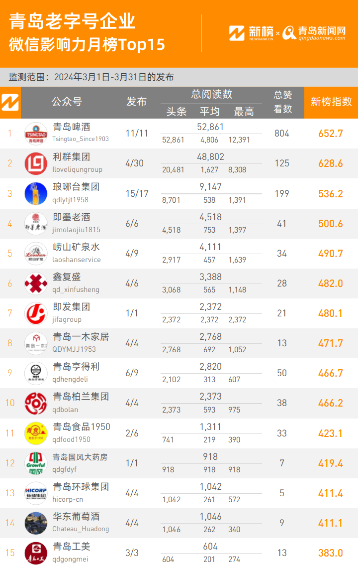 2024年3月青島老字號(hào)企業(yè)微信影響力排行榜TOP15即刻揭曉。本期榜單統(tǒng)計(jì)周期是2024年3月1日到2024年3月31日。