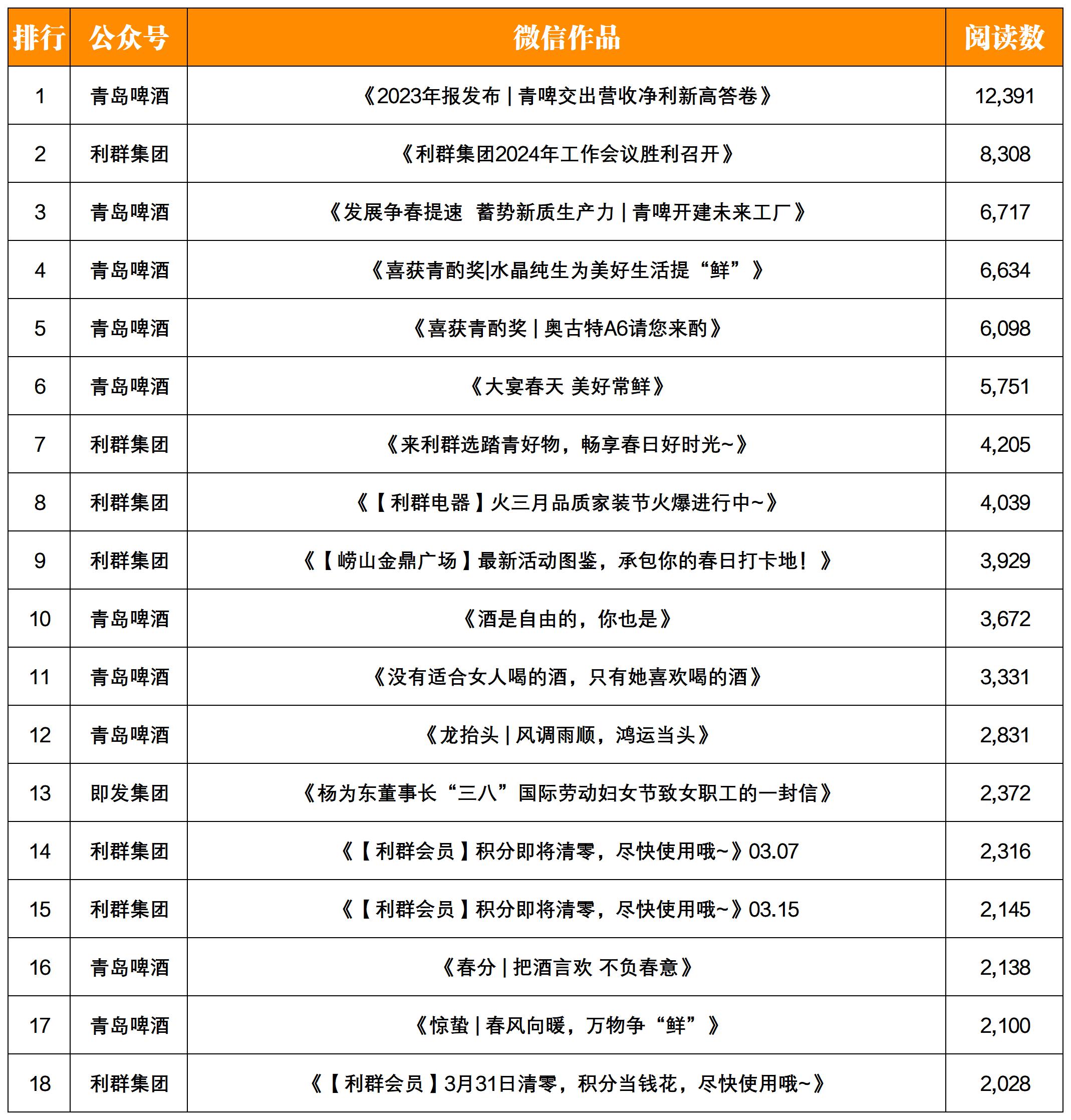 熱文方面,“青島啤酒”以總閱讀數(shù)5.2w+超過“利群集團(tuán)”,獲得本期最具影響力獎(jiǎng)。本期有一篇閱讀數(shù)過萬的文章,來自“青島啤酒”的《2023年報(bào)發(fā)布 | 青啤交出營(yíng)收凈利新高答卷》一文,本期成績(jī)非常亮眼。