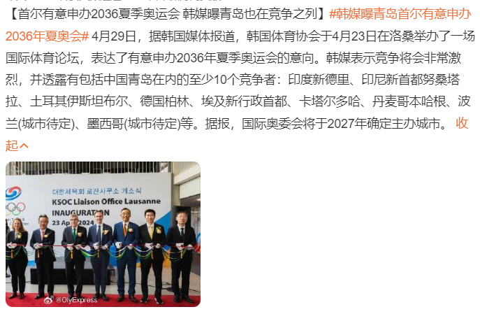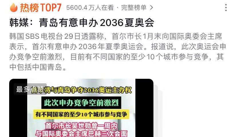 4月29日,青島申辦奧運(yùn)會的消息,經(jīng)由韓國媒體報(bào)道,成為熱門話題,“#韓媒曝青島首爾有意申辦2036年夏奧會#”沖上熱搜,引發(fā)網(wǎng)友熱議。