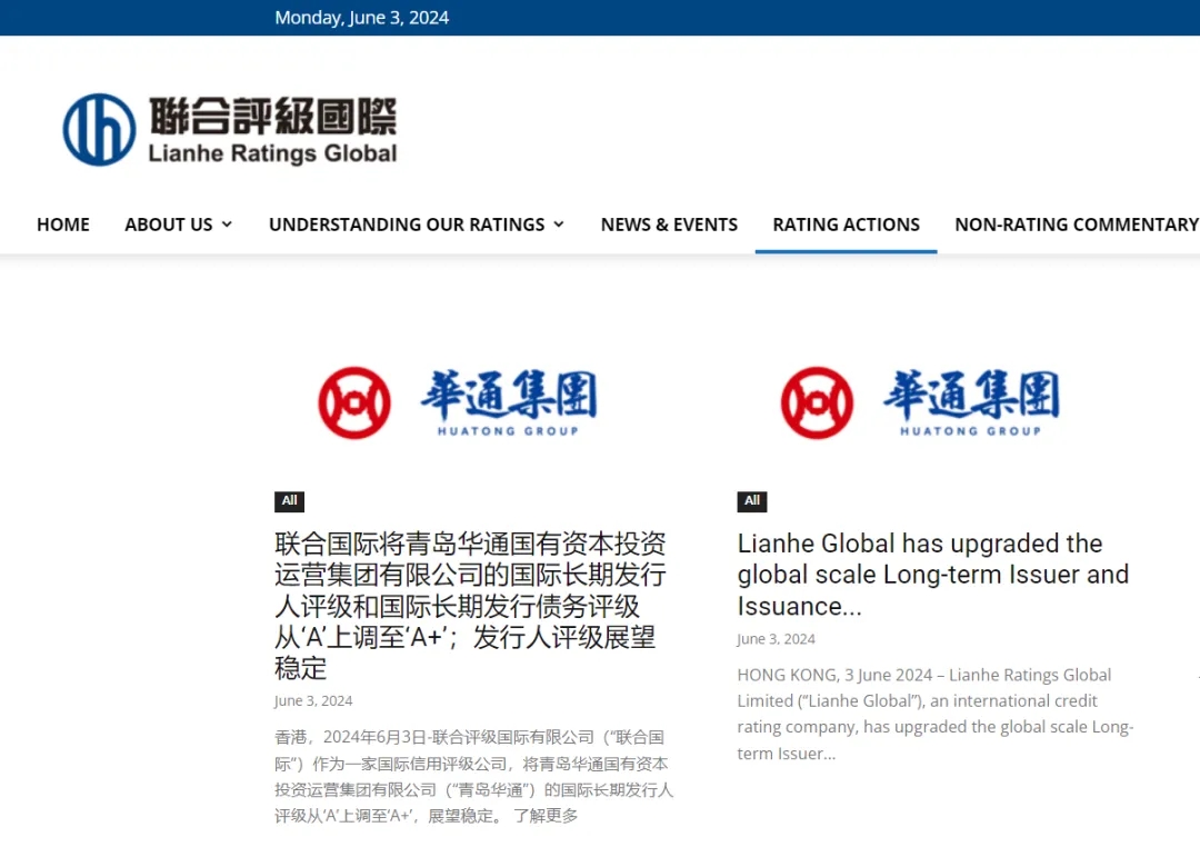 6月3日,聯(lián)合評級國際有限公司(以下簡稱“聯(lián)合國際”)正式宣布,確認將青島華通國有資本投資運營集團有限公司(以下簡稱“華通集團”)的國際長期發(fā)行人評級由“A”上調(diào)至“A+”、展望“穩(wěn)定”。這是聯(lián)合國際目前在山東省內(nèi)授予企業(yè)的最高等次評級結(jié)果,也是華通集團自今年2月獲得惠譽國際評級提升后的又一次晉檔躍升。