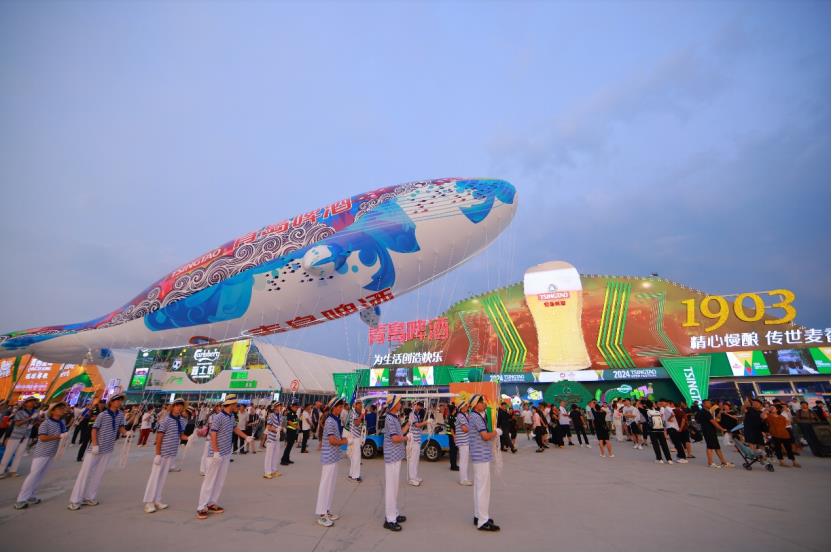在金沙灘啤酒城,夜晚有無人機表演和藝術(shù)巡游,游客能目睹青島啤酒logo組成的超級鯨魚造型從人群中穿行而過,遨游在啤酒節(jié)歡樂的海洋中。伴著金沙灘啤酒城流光溢彩,展示著“醉”美夏夜。