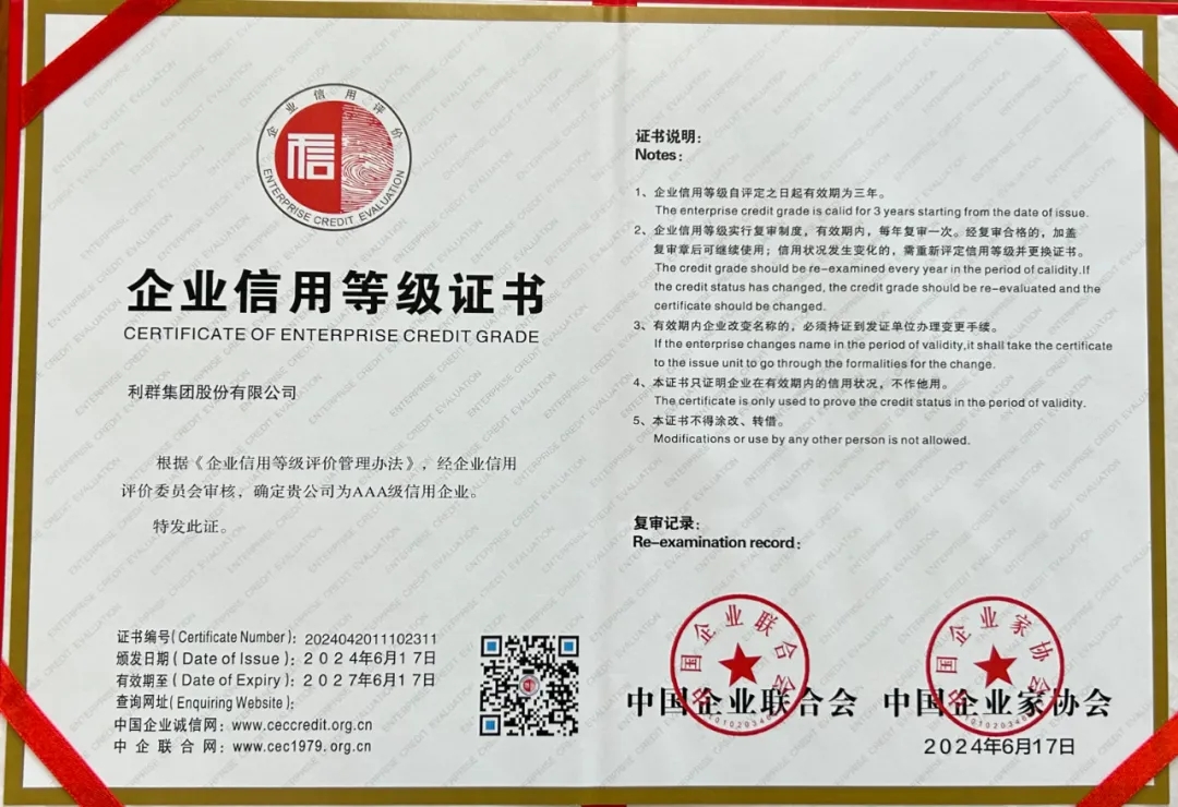 近日,在由“中國企業(yè)聯(lián)合會”、“中國企業(yè)家協(xié)會”開展的2024年企業(yè)信用等級評價(jià)活動(dòng)中,利群集團(tuán)股份有限公司被評為“企業(yè)信用評價(jià)AAA級信用企業(yè)”。